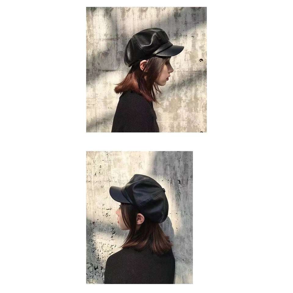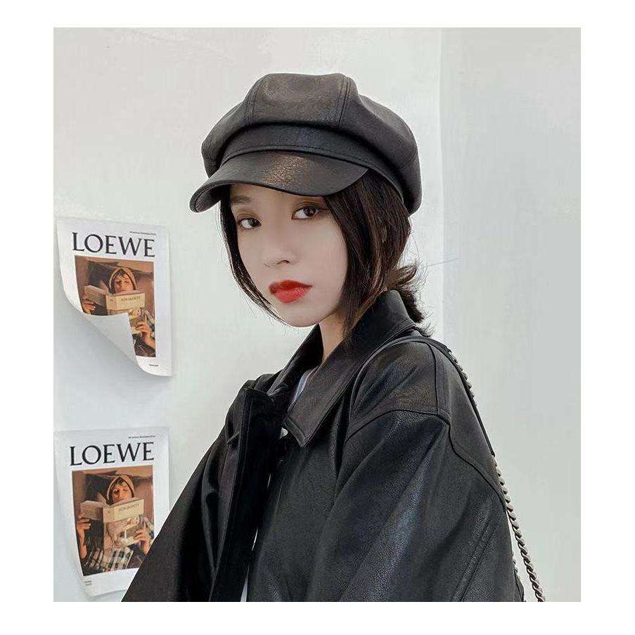 หมวกเบเร่ต์หนังทรงแปดเหลี่ยมสำหรับผู้หญิงวัสดุ Pu หมวกฤดูใบไม้ร่วงฤดูหนาวสไตล์เกาหลี
