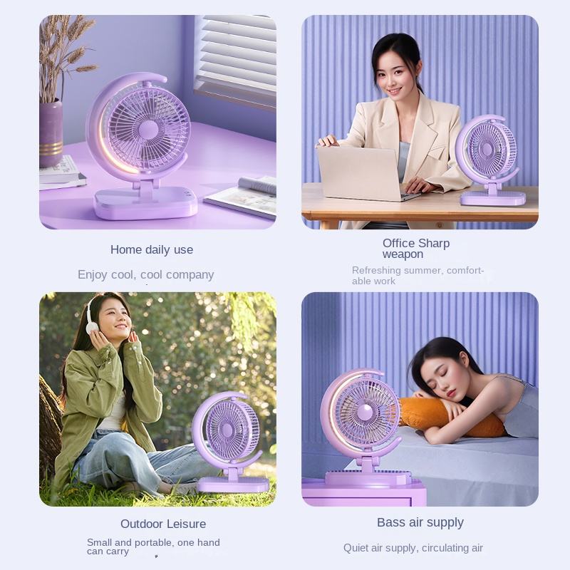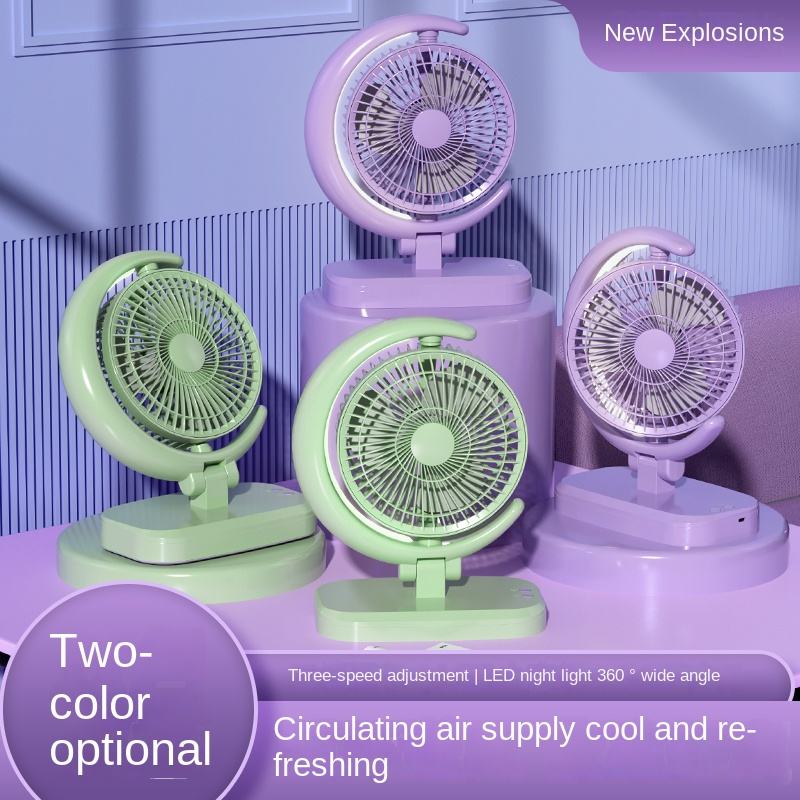 พัดลม USB ชาร์จไฟได้มีไฟ LED, พัดลมไอน้ำทรงดวงจันทร์ขนาดเล็กลมแรงสำหรับใช้ในฤดูร้อนพัดลมใช้ในสำนักงานอุปกรณ์เสริมทำนองเพลงของฉัน