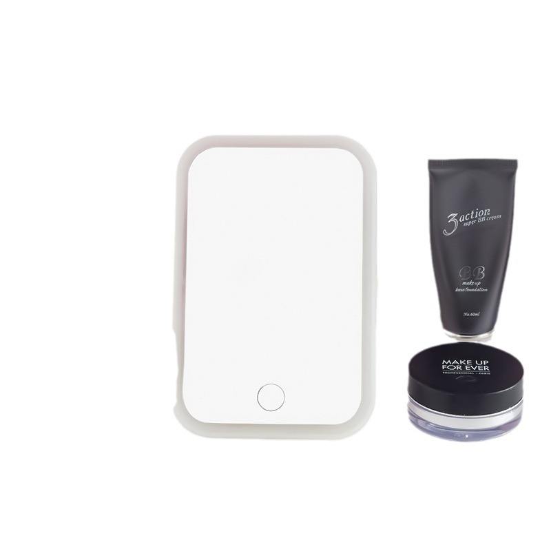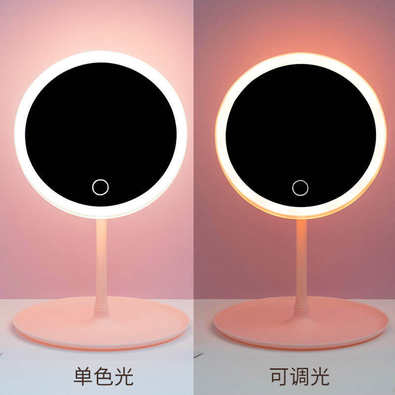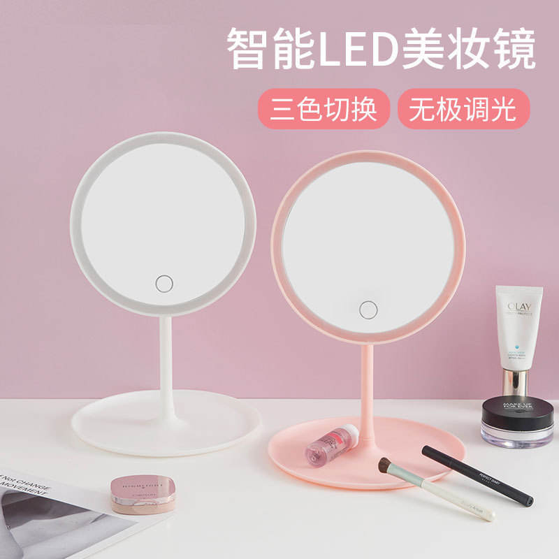 กระจกแต่งหน้า LED ทรงกลมสีขาวชมพู ปรับแสงได้ กระจกเครื่องสำอางตั้งโต๊ะพร้อมไฟ LED แบบชาร์จไฟได้สามสี