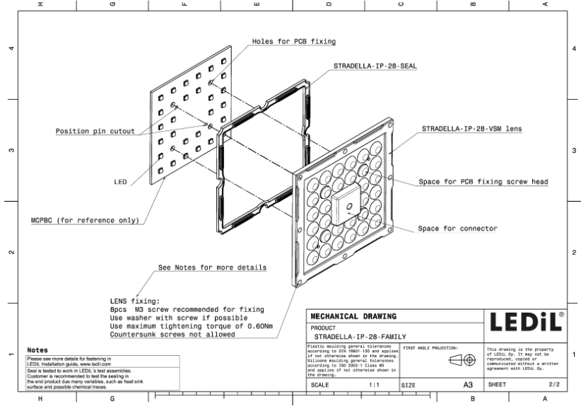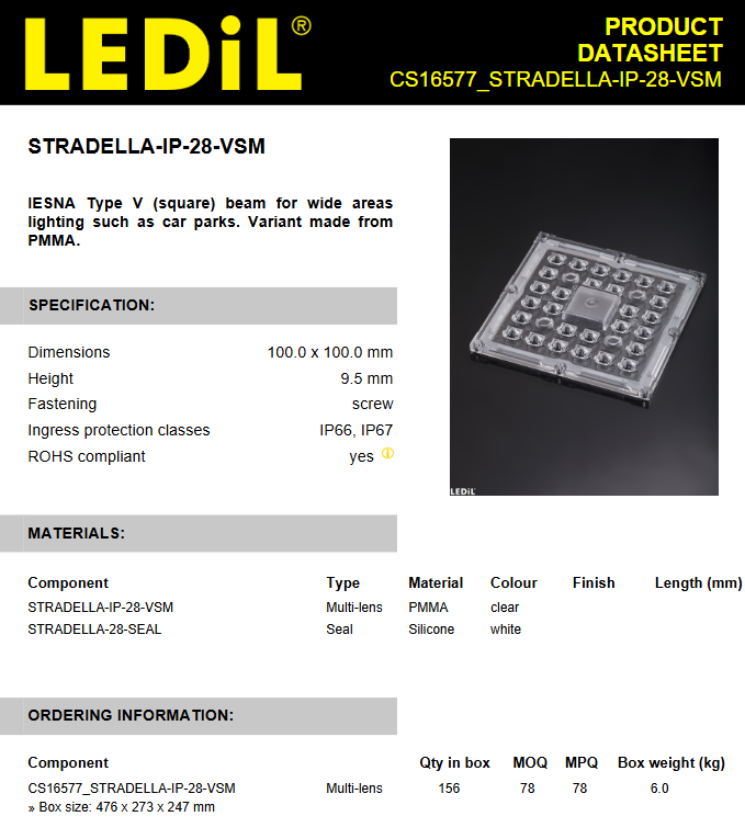 เลนส์ LED รุ่น Ledils CS16577_STRADELLA-IP-28-VSM PMMA รูปทรงสี่เหลี่ยมผืนผ้า 28POS ใส 138-144 ฟลัด พร้อมสกรูยึดสำหรับติดตั้งไฟ LED
