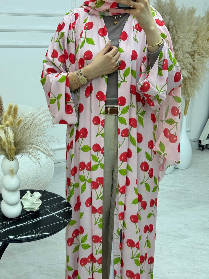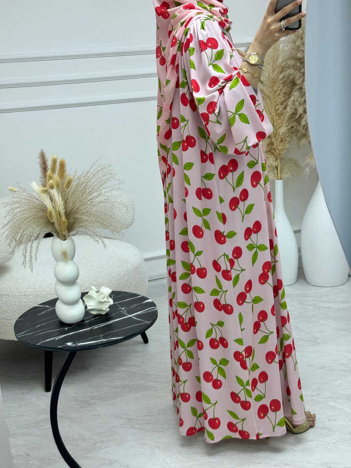 เดรสยาวพิมพ์ลายเชอร์รี่สีชมพูอ่อนแบบสั่งตัดของ Leduo สไตล์หลวมๆ แบบอาบายะห์สำหรับชาวมุสลิม