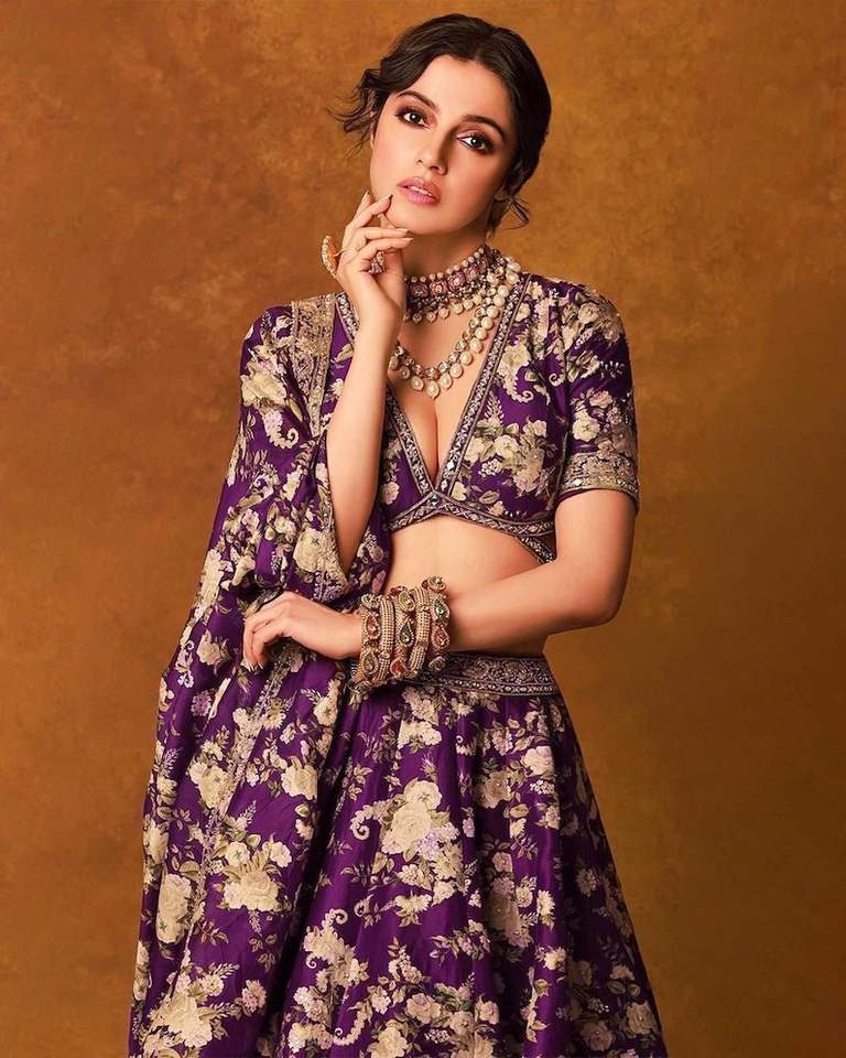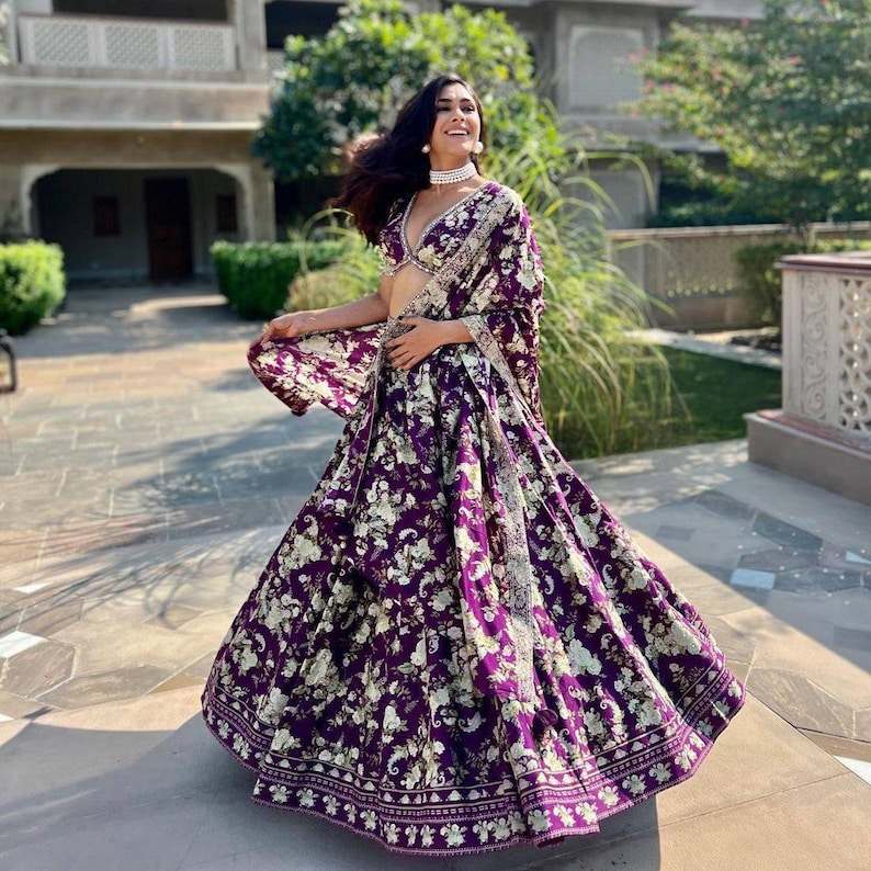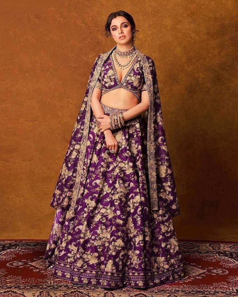 Lehenga โชลีสําหรับผู้หญิงสีม่วงพิมพ์ลายดอกไม้เลื่อม Zari เย็บปักถักร้อยงานออกแบบพรรคสวมใส่อินเดียชุดแต่งงานชุดเจ้าสาว