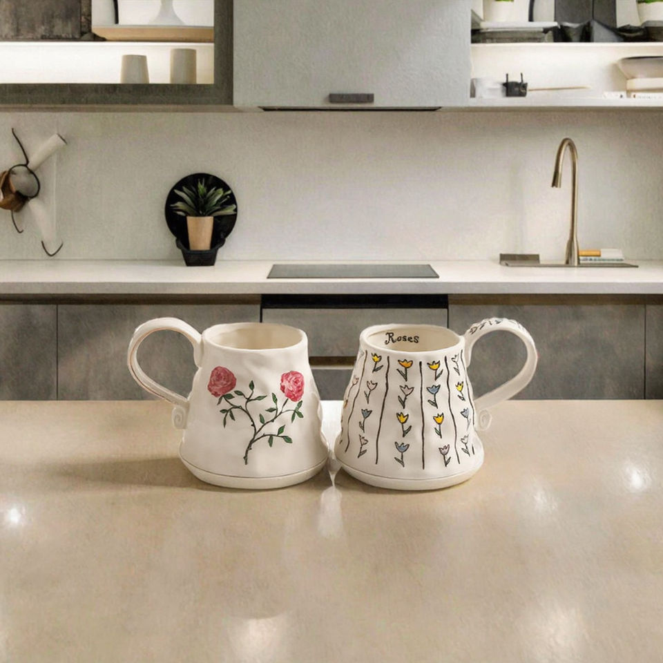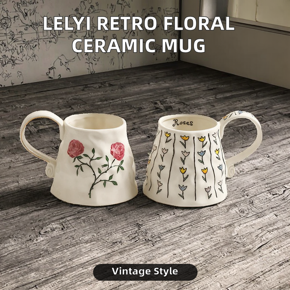 Lelyi Retro Hand-Painted Floral Porcelain Ceramic Mug Handgrip-Sustainable Dishwasher Microwave Safe Creative Irregular Cup