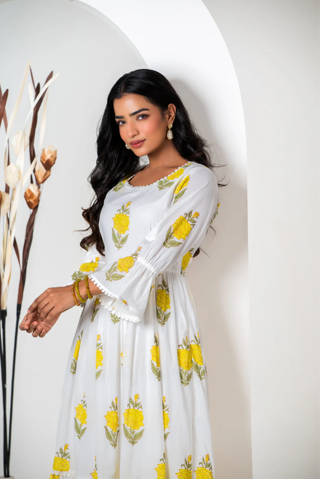 ชุดแมกซี่เดรสลำลองสำหรับผู้หญิง, เดรสลำลองลายดอกเลมอนเดรสผ้าฝ้ายปิดคอ