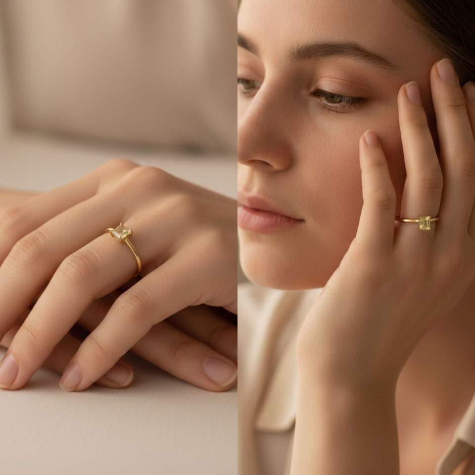 แหวนเงินแท้ชุบทองทรงสี่เหลี่ยมประดับด้วยเลมอนควอตซ์ ได้รับการรับรองจาก IGI เหมาะสำหรับงานแต่งงานและงานปาร์ตี้