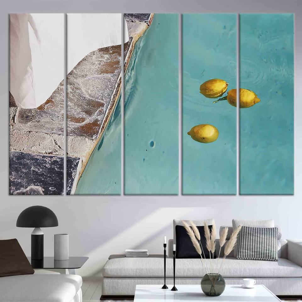 ภาพพิมพ์ผ้าใบลายสระว่ายน้ำเลมอน: ภาพพิมพ์ตกแต่งผนังห้องนั่งเล่นสไตล์โบโฮ ชุดผ้าใบ 5 ชิ้น