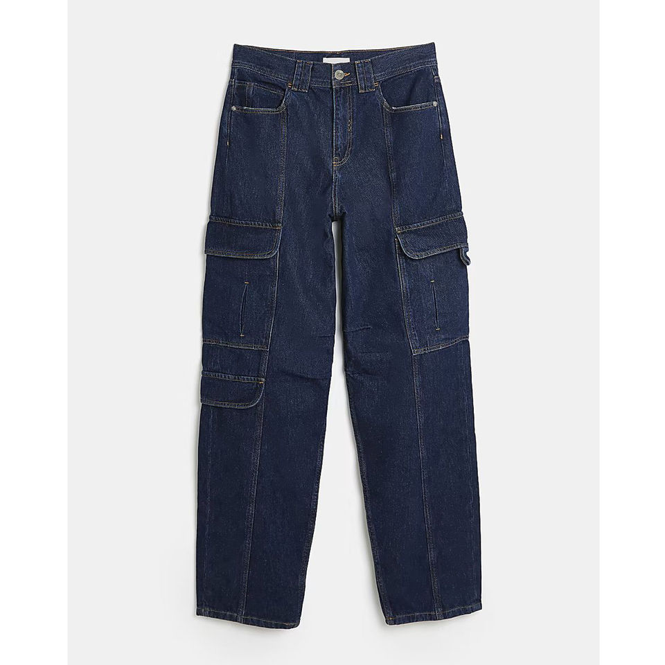 กางเกงยีนส์เดนิมสีน้ำเงินเข้มทรงหลวมตรงสำหรับผู้หญิง มีกระเป๋าหกช่อง สวมใส่สบายในฤดูหนาว ผ้าฝ้าย 100% ระบายอากาศได้ดี แห้งเร็ว เอวสูง รับผลิตแบบ OEM