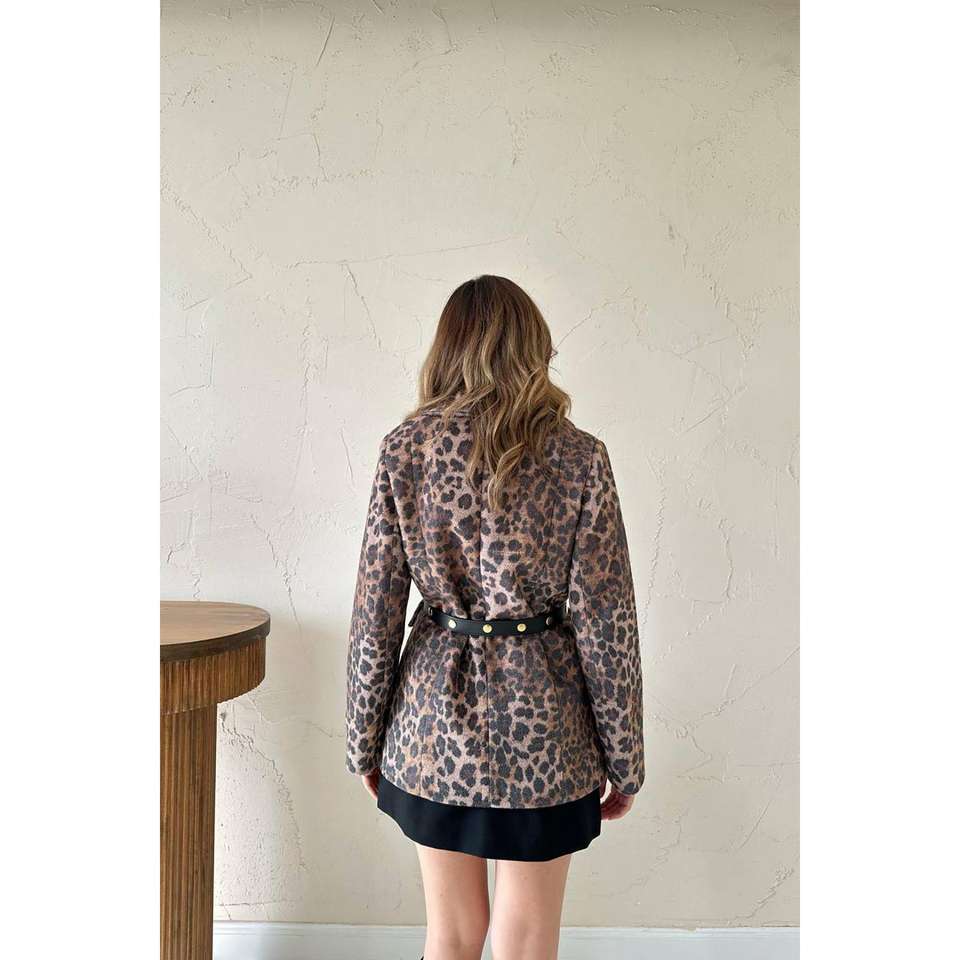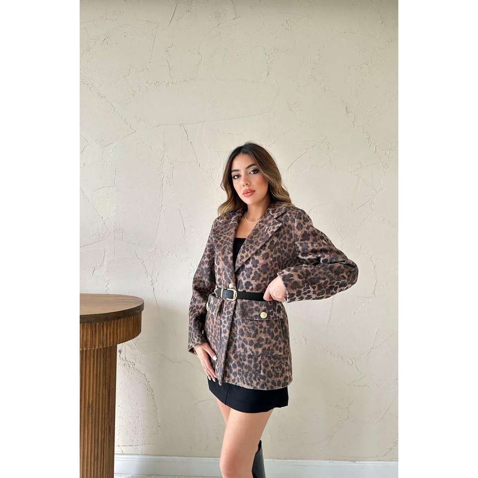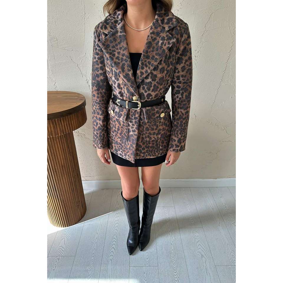 เสื้อเบลเซอร์ลายเสือดาวสำหรับผู้หญิง แจ็คเก็ตผ้าทอสำหรับฤดูใบไม้ร่วง พร้อมเข็มขัดสีทอง แขนยาวเต็มตัว
