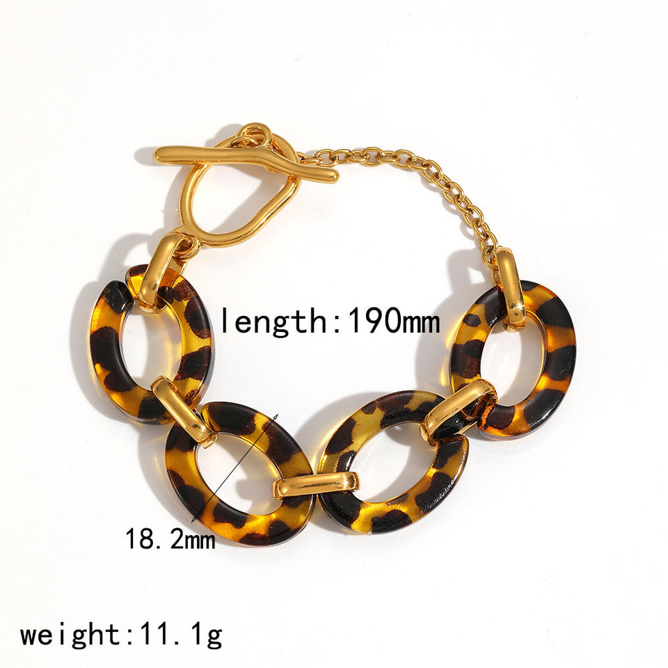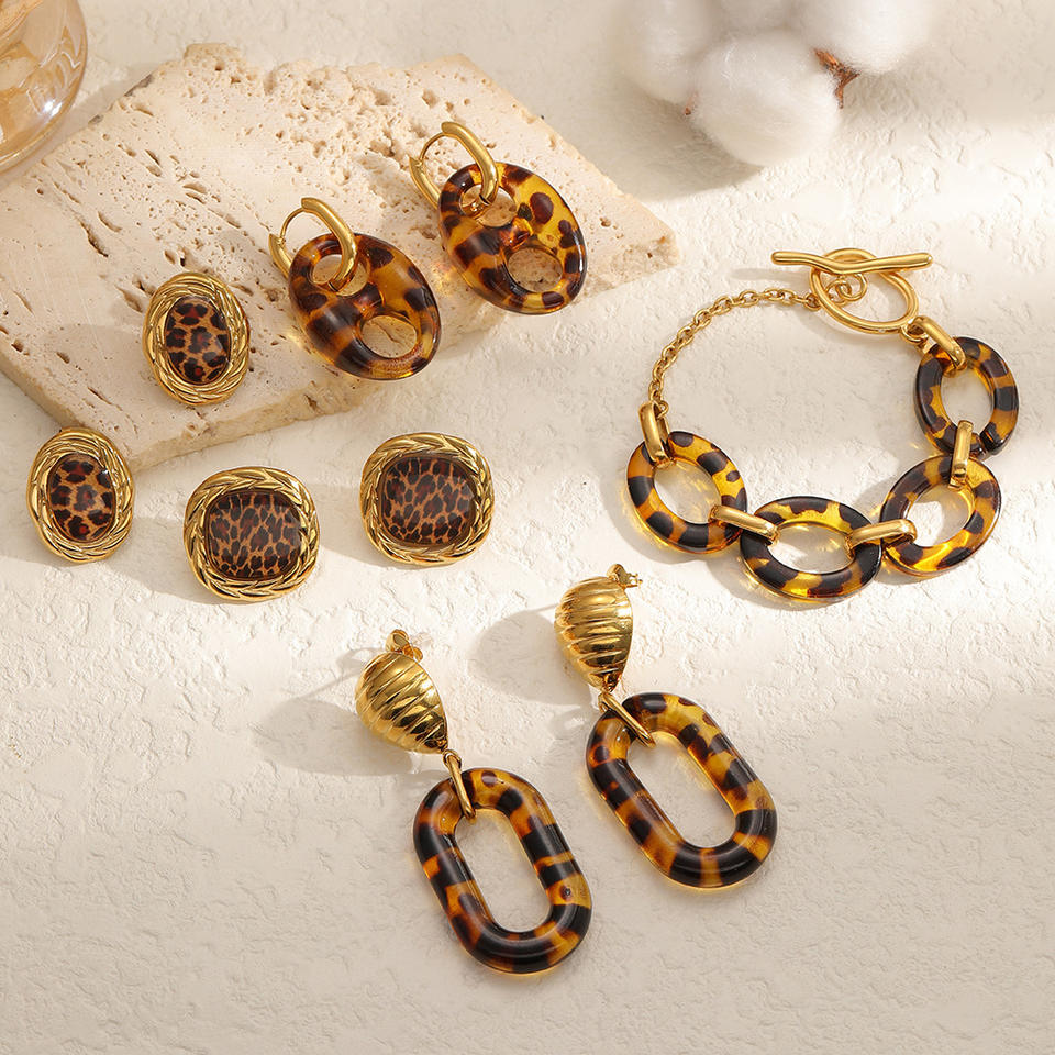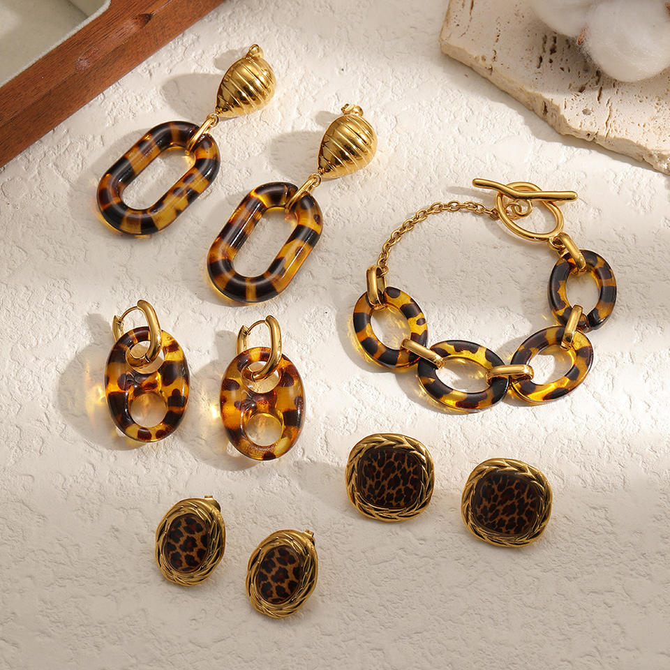ชุดเครื่องประดับสแตนเลสลายเสือดาว ต่างหูรูปวงรีเรขาคณิต สร้อยข้อมือ แฟชั่นสำหรับงานปาร์ตี้ ชุบทอง
