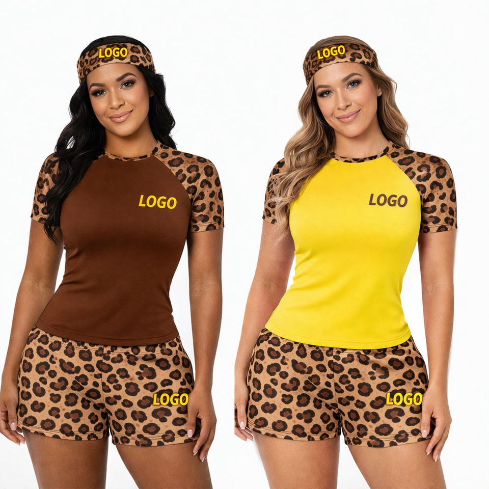 ชุดออกกำลังกายลายเสือดาวสองชิ้น เสื้อยืดแขนสั้นและกางเกงขาสั้นเข้าชุด ชุดออกกำลังกาย ชุดลำลองฤดูร้อน