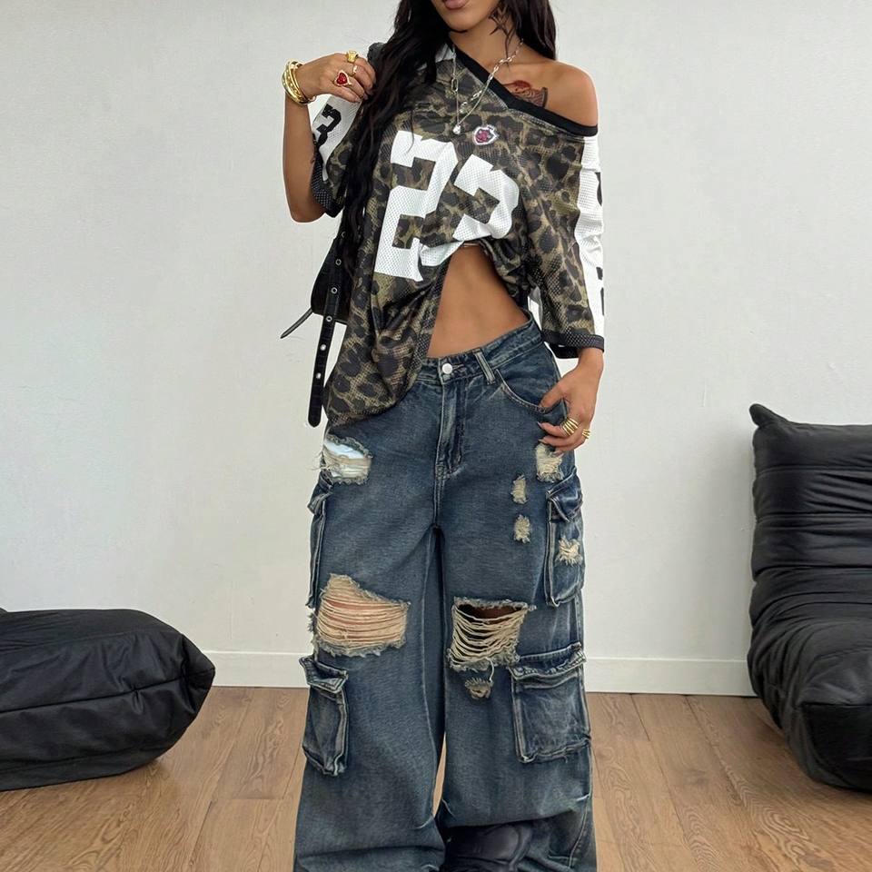 เสื้อเจอร์ซีย์อเมริกันฟุตบอลลายเสือดาวสำหรับผู้หญิง ผ้าตาข่าย ทรงโอเวอร์ไซส์ สตรีทแวร์ พิมพ์ลายกราฟิก หมายเลขแฟชั่น Y2K ระบายอากาศได้ดี ผลิตจากโพลีเอสเตอร์ รับผลิตแบบ OEM