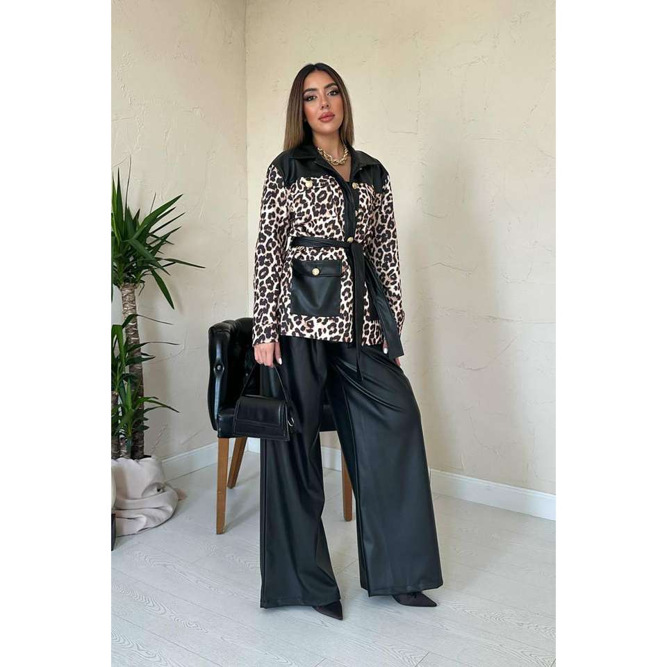 เสื้อโค้ทผู้หญิงลายเสือดาว แต่งขอบหนังสีดำ แขนยาว ผ้าทอ กันลม