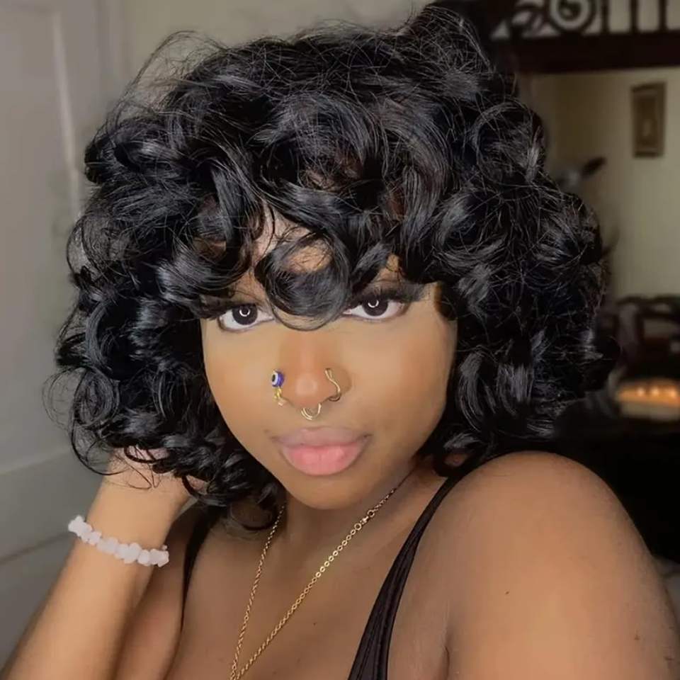 วิกผมบ๊อบแบบหลวมๆ ยี่ห้อ Letsfly พร้อมหน้าม้า ขนาด 12 นิ้ว สีต่างๆ ผลิตด้วยเครื่องจักรทั้งหัว ไม่มีเชือกผูก วิกผมลอนเด้งเป็นธรรมชาติ ทำจากผมมนุษย์ รุ่น F1818