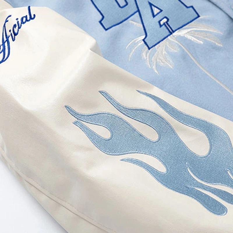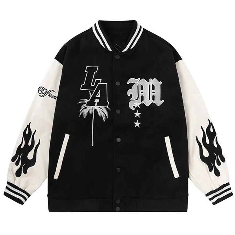 เสื้อแจ็กเก็ตเบสบอลวินเทจของผู้ชายเสื้อกันลมสไตล์ฮิปฮอปเสื้อโค้ทไฮสตรีทปักลายตัวอักษร Y2K ลายหนังแกะเปลวไฟเสื้อโค้ทไฮสตรีท