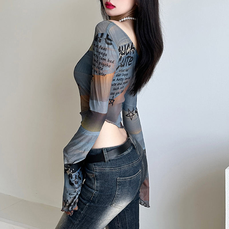เสื้อครอปแขนยาวผ้าตาข่ายพิมพ์ลายตัวอักษร ไหล่เดียว ชายเสื้อไม่เท่ากัน ทรงเข้ารูป เซ็กซี่ สไตล์สตรีทแวร์ ซีทรู
