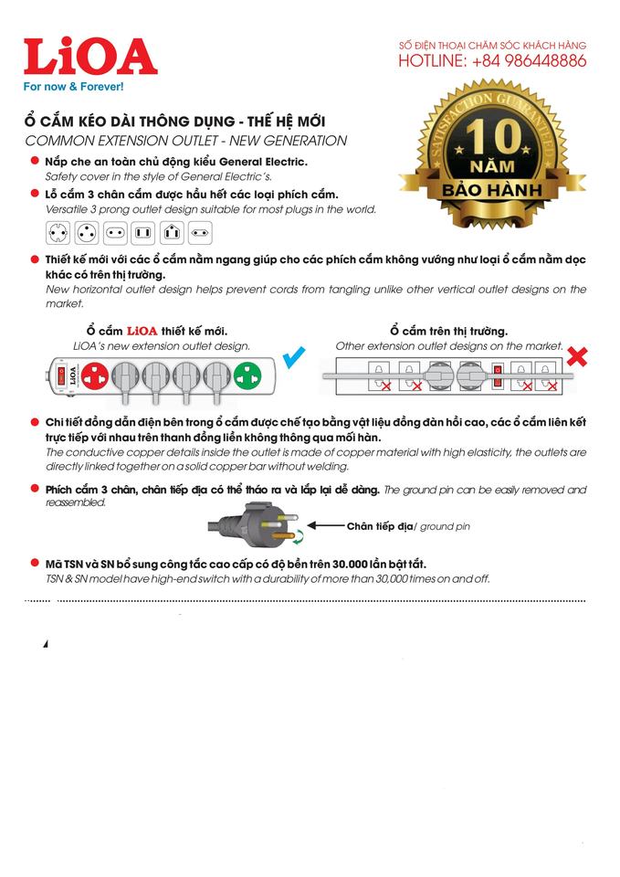 Lioa ช่องเสียบสายไฟต่อพ่วงสูง2200วัตต์220VAC/10A พร้อมสวิตช์สายดินด้วยตัวเอง5เมตร6SND5.3.10สีดำ