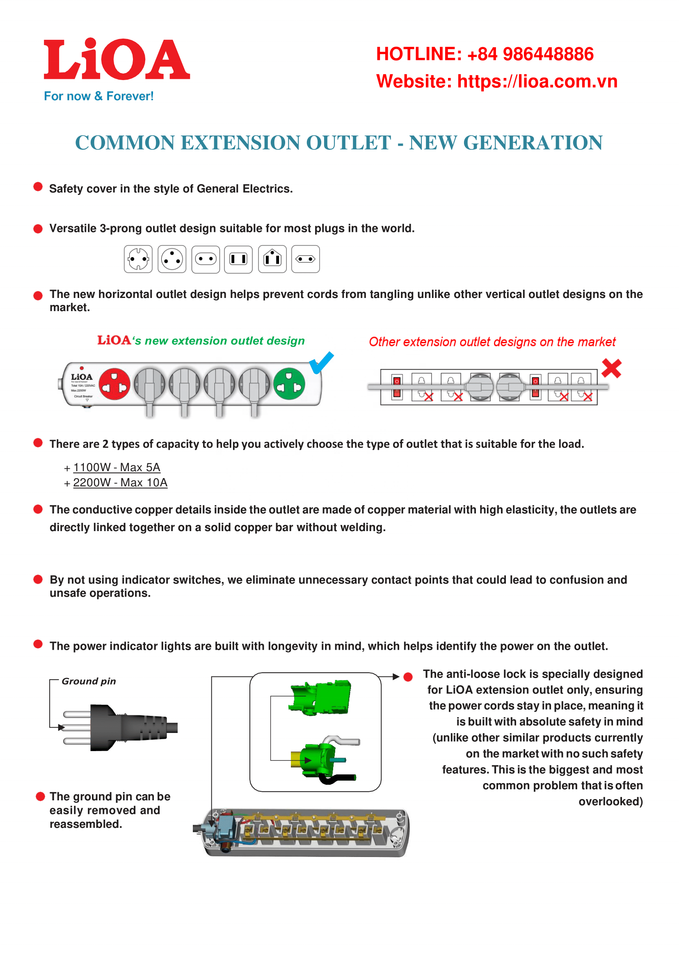 Lioa เต้ารับต่อขยาย4เต้าเสียบรุ่นใหม่1100W (220VAC)/สายเคเบิลความจุ5A 3เมตรมีสายดินด้วยตนเองรุ่น4TN3.3.5