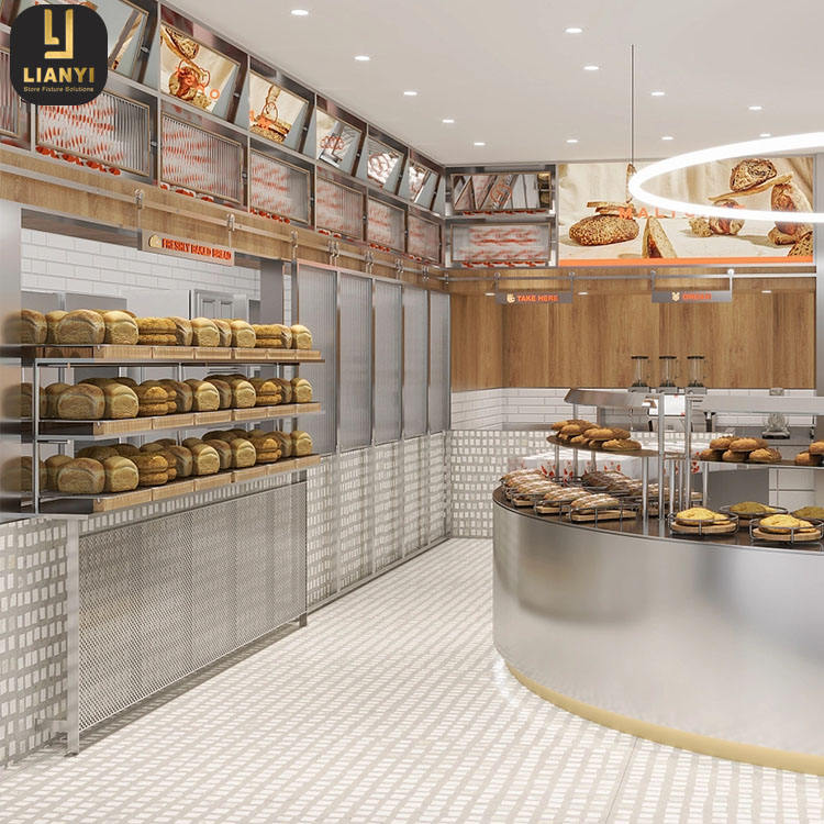 Lianyi ชั้นวางของโลหะแบบตะแกรงตั้งโชว์ขนมปังปรับแต่งได้สำหรับ LY-BAKERY เบเกอรี่