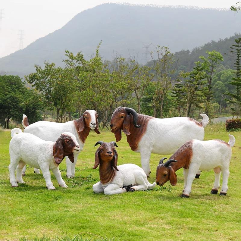 เครื่องประดับกลุ่มครอบครัวแพะโบเออร์ไฟเบอร์กลาสเรซินขนาดเท่าของครอบครัวรูปปั้นแพะทำจากไฟเบอร์กลาสสำหรับสวน