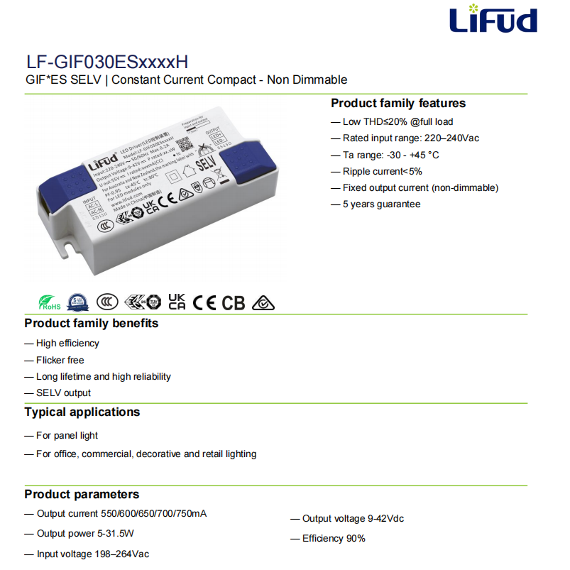 ไดรเวอร์ LED อลูมิเนียมประสิทธิภาพสูง Lifud Lf-Gifxxxes มาตรฐาน EU แบบ AC-DC ปราศจากการกะพริบ สำหรับไฟแผง 50W รับประกัน 5 ปี ได้รับมาตรฐาน CE