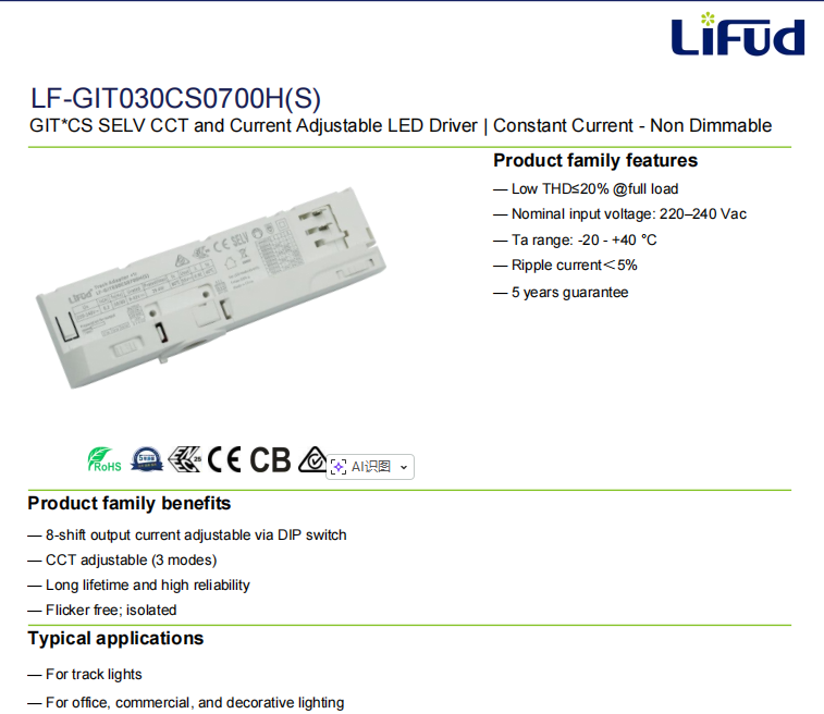 ไดรเวอร์ LED Lifud Lf-Gitxxxcs AC-DC พร้อมปรับค่า CCT และกระแสไฟได้ 21-44.1 วัตต์ ตัวเครื่องอะลูมิเนียม รับประกัน 5 ปี