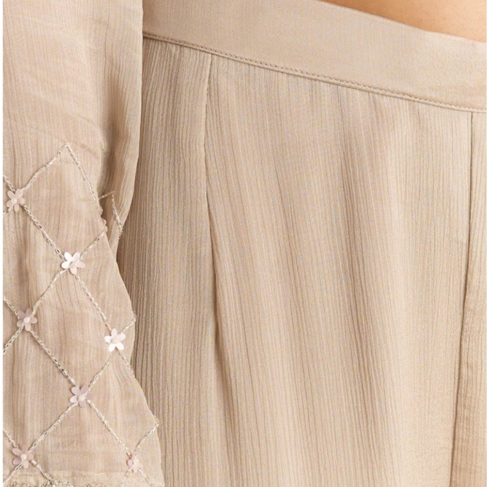 ชุดสูทสีเบจผ้าชินอนเคอร์ตาพาลาซโซพร้อมหอยเชลล์คัตดานา