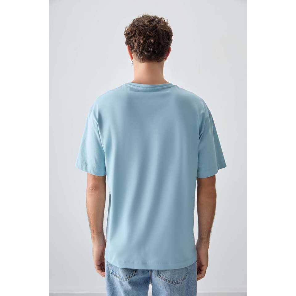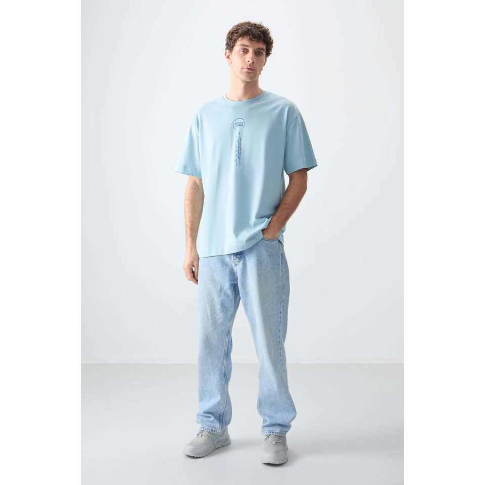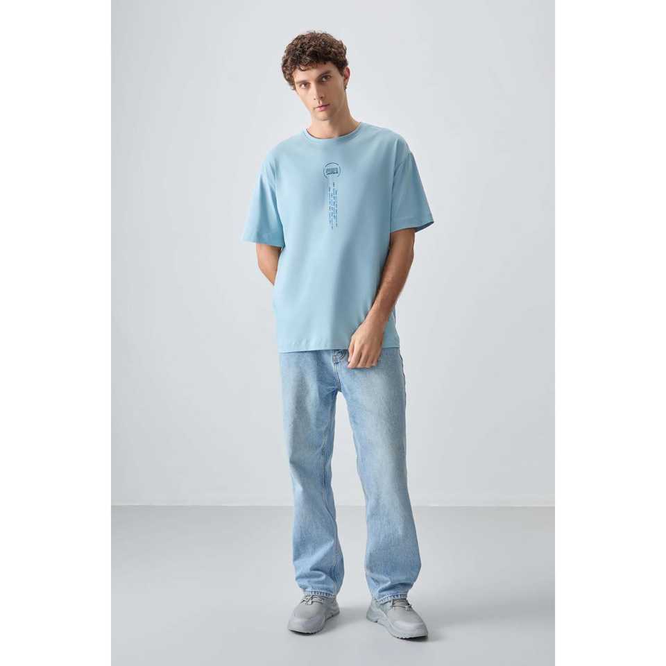 เสื้อยืดผู้ชายสีฟ้าอ่อน ผ้าฝ้ายถัก 100% เนื้อหนานุ่ม ทรงโอเวอร์ไซส์ พิมพ์ลาย-88355