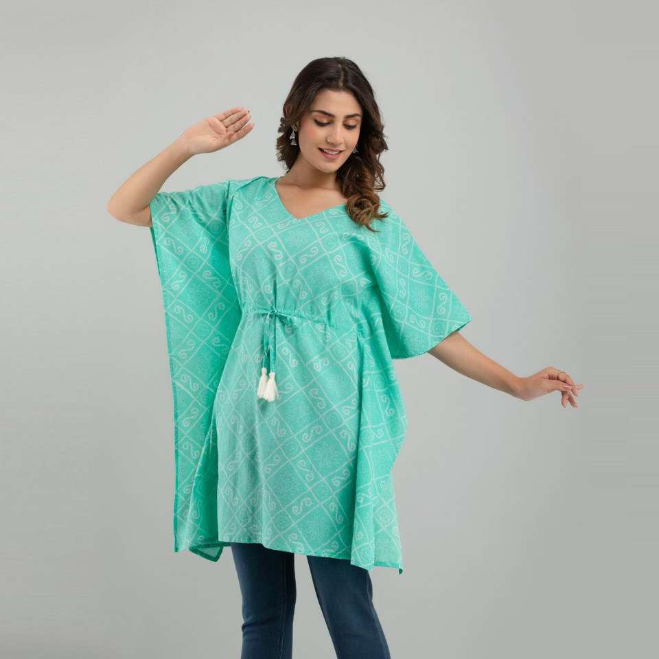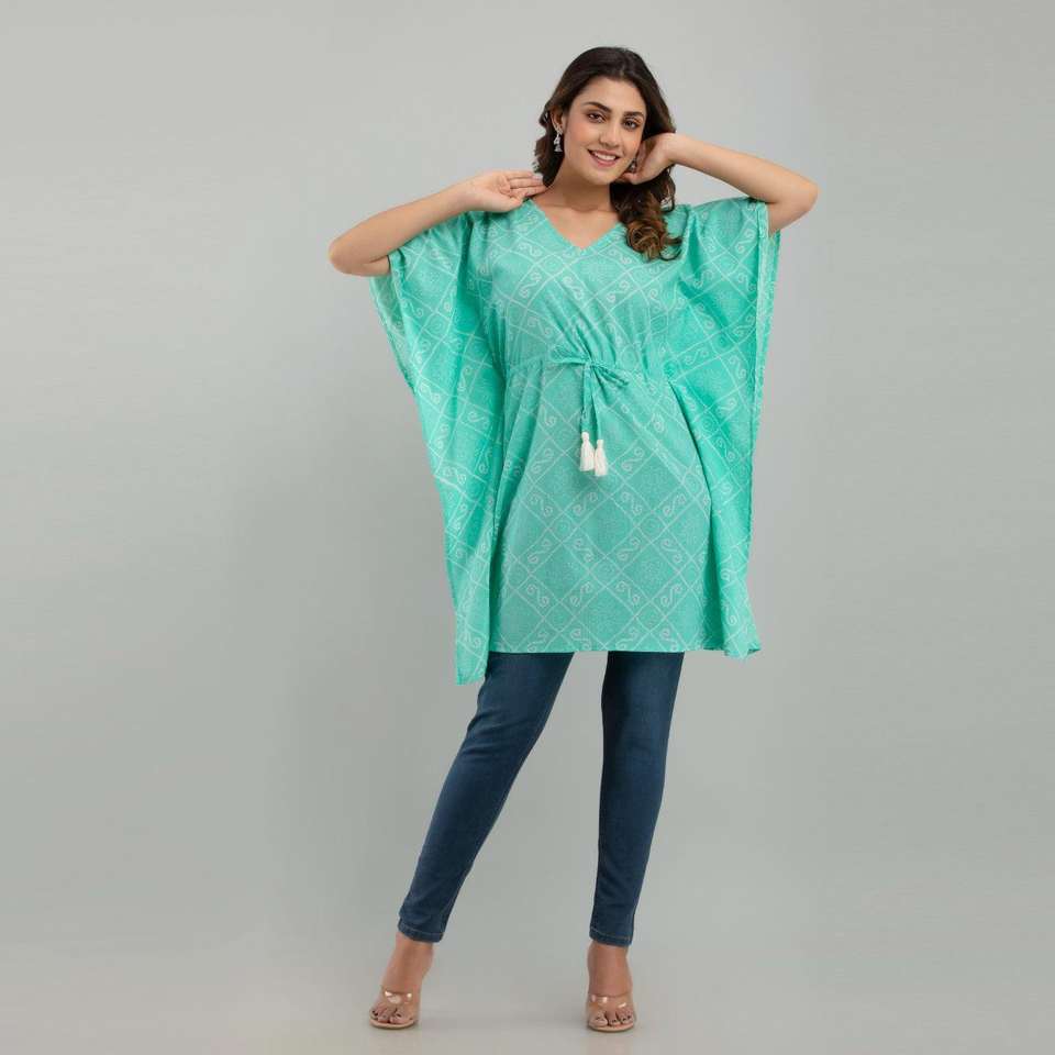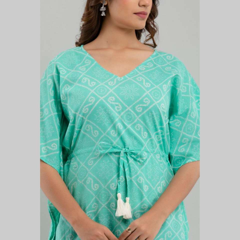 ชุดเดรสคาฟตันผ้าฝ้ายพิมพ์ลาย Bandhani สีฟ้าอ่อนหรูหราสบายๆดีไซน์โอดีสำหรับวันฟรีไซส์-ความยาวพื้นสำหรับชายหาดฤดูร้อน