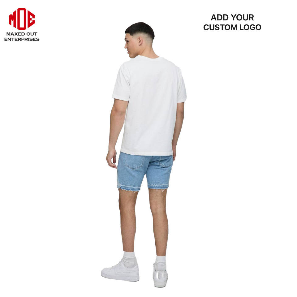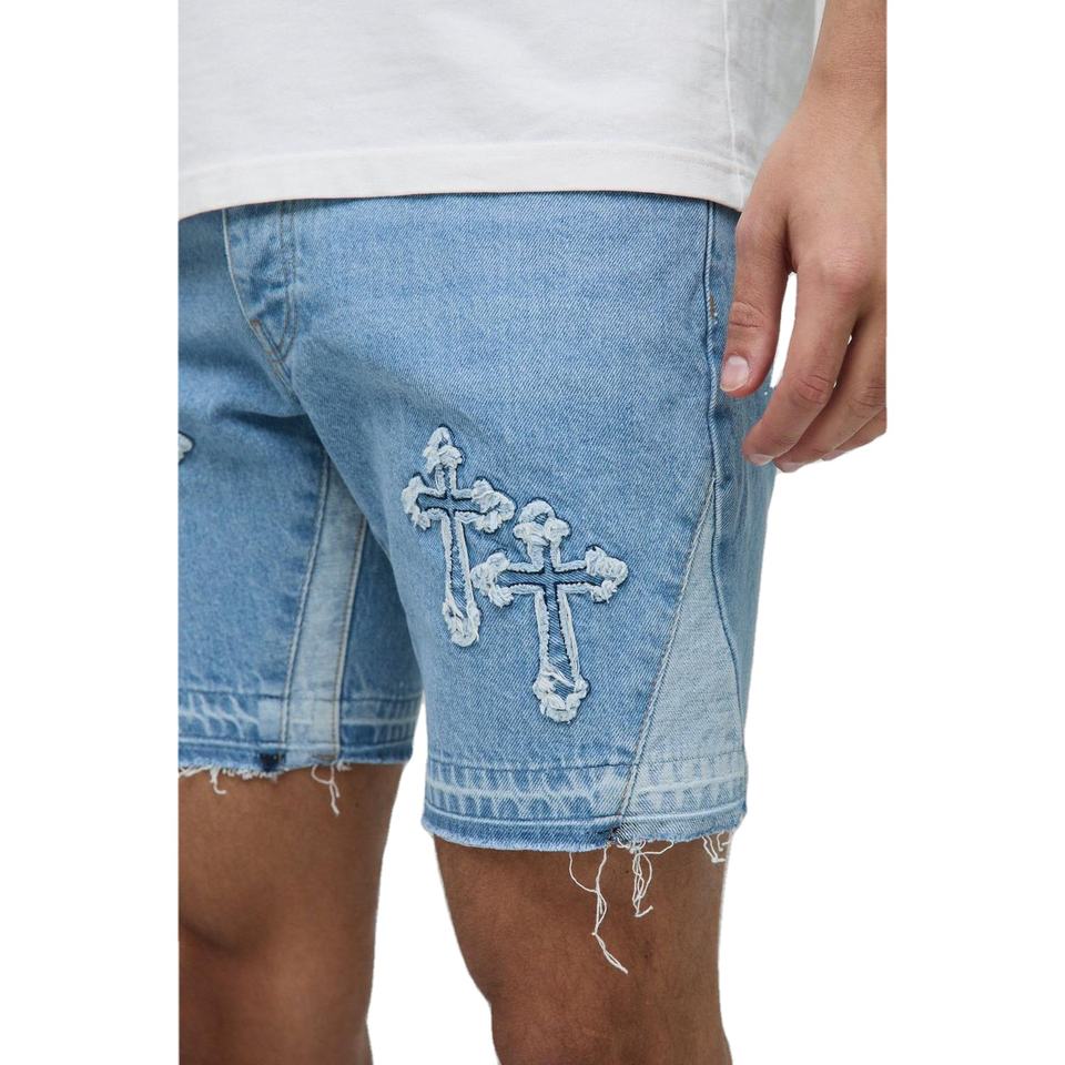 Light Blue Denim Shorts with Cross Patches for Men Custom Streetwear Raw Hem Distressed Embroidery Casual Jorts OEM Manufacturer