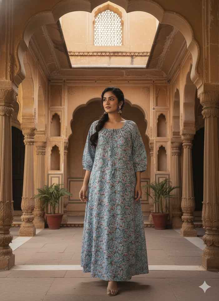 ชุดเดรสลำลองสไตล์โบฮีเมียนสีฟ้าอ่อนลายดอกไม้ แขนสามส่วน ผ้าฝ้าย ความยาวปานกลาง เอวธรรมชาติ ใส่สบายสำหรับฤดูร้อน เป็นมิตรต่อสิ่งแวดล้อม