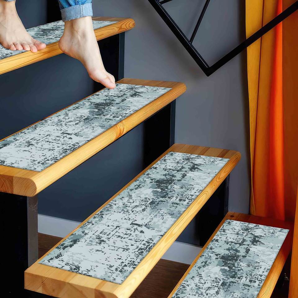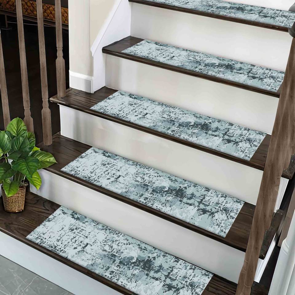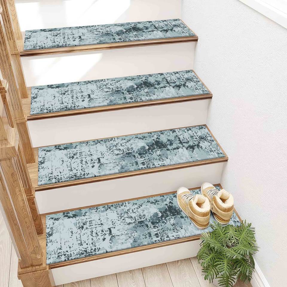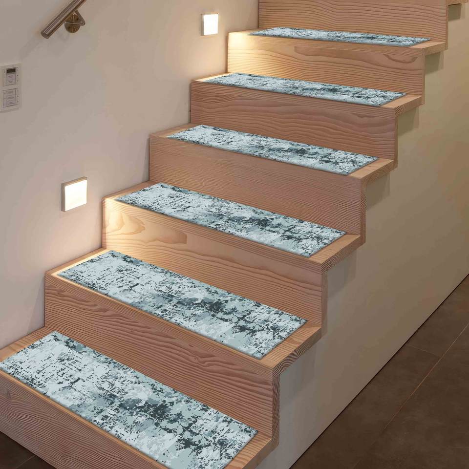 พรมลายพิมพ์สีเขียวฟ้าอ่อน ดีไซน์แบบ Step Kilim ทันสมัย ซักเครื่องได้ พรมปูพื้นแบบ Step