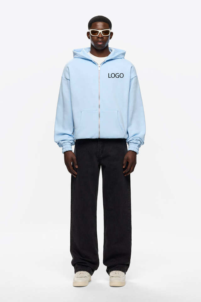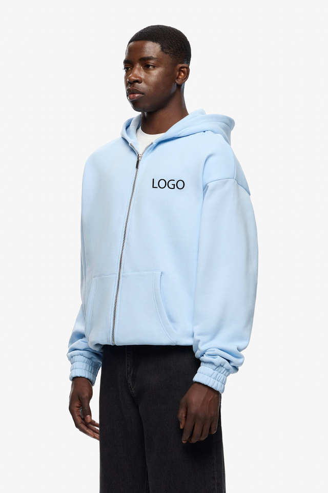 ชุดเสื้อฮู้ดแบบมีซิปของผู้ชายผ้าคอตตอน100% พรีเมี่ยมสีน้ำเงินอ่อนชุดใส่ให้ความอบอุ่นในฤดูหนาวพอดีตัวปกติมีสไตล์ระบายอากาศได้ดีติดโลโก้ได้ตามต้องการ