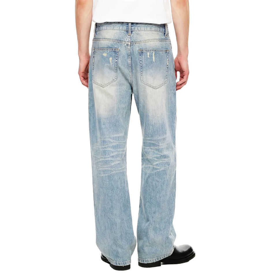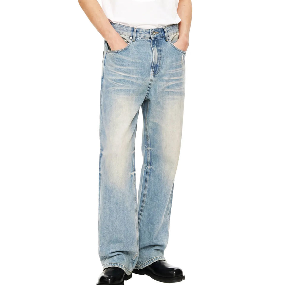 กางเกงยีนส์สตรีทแวร์สีฟ้าอ่อน ทรงแบ็กกี้ ขาตรง สไตล์วินเทจ ล้างสีแบบโบราณ พร้อมลายวอเตอร์มาร์คแบบฟรอสต์