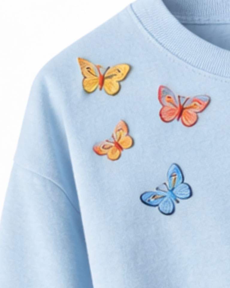 เสื้อยืดครอปปักลายผีเสื้อสีฟ้าอ่อนสำหรับผู้หญิง ผ้าฝ้าย แขนสั้น สไตล์ลำลอง ทรงหลวม แฟชั่นฤดูร้อน เสื้อยืดลายกราฟิก ขายส่ง