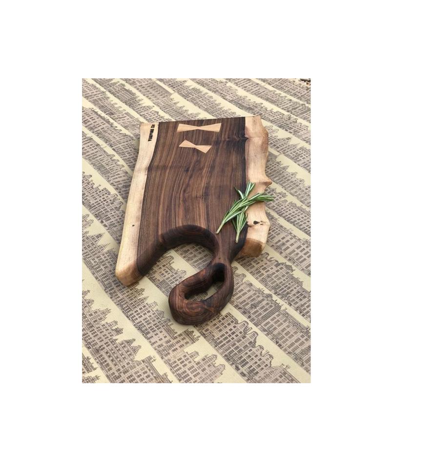 เขียงสีน้ำตาลอ่อนเขียงที่มีด้ามจับและกระดานช็อปปิ้งทำด้วยมือทำจากไม้