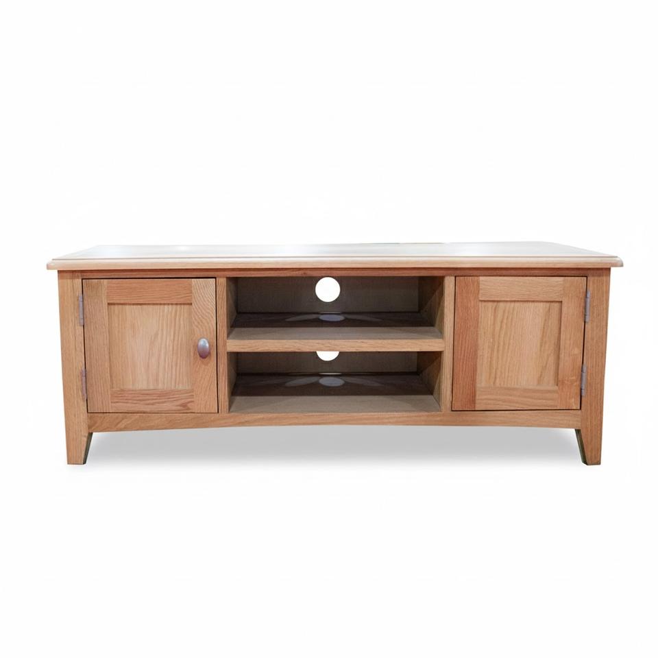 ตู้วางทีวีไม้สีน้ำตาลอ่อนธรรมชาติ ทนทาน พร้อมตู้เก็บของและชั้นวางแบบเปิด ดีไซน์ทันสมัย เฟอร์นิเจอร์ห้องนั่งเล่น ผลิตในเวียดนาม