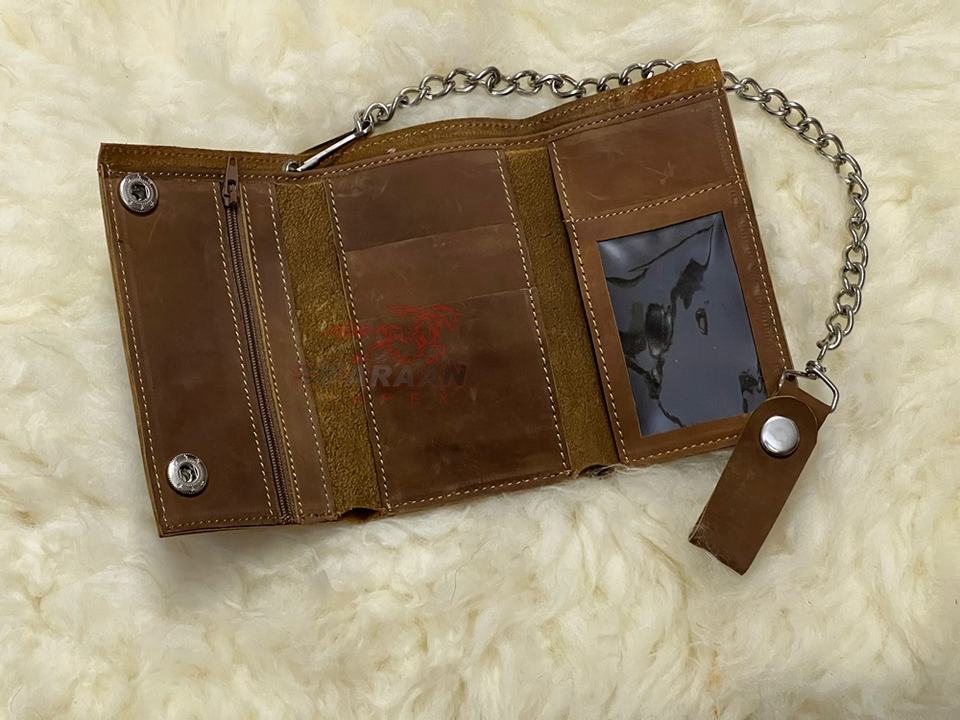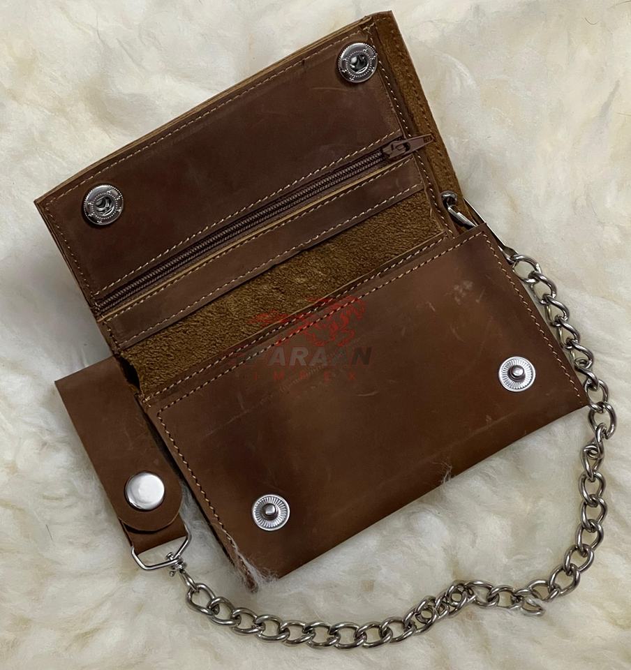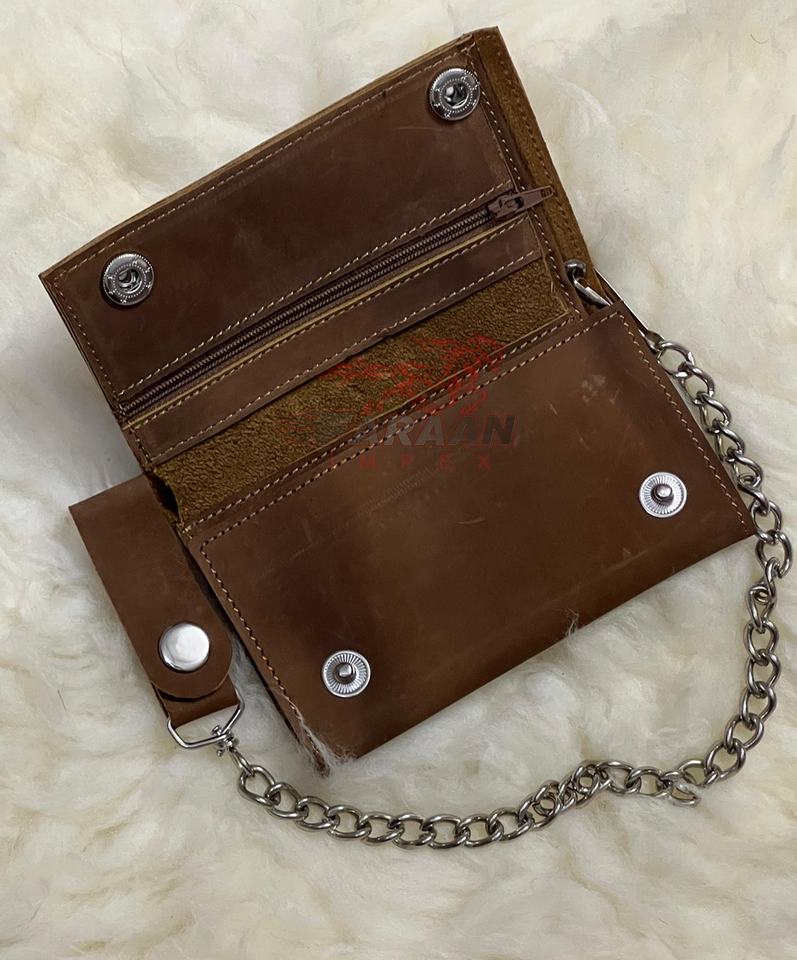 กระเป๋าสตางค์สีน้ำตาลอ่อนพร้อมห่วงโซ่ลายนูนสำหรับผู้ชายกระเป๋าสตางค์แบบบางความจุขนาดใหญ่พร้อมที่ใส่บัตรแบบสั่งทำลายกะโหลก