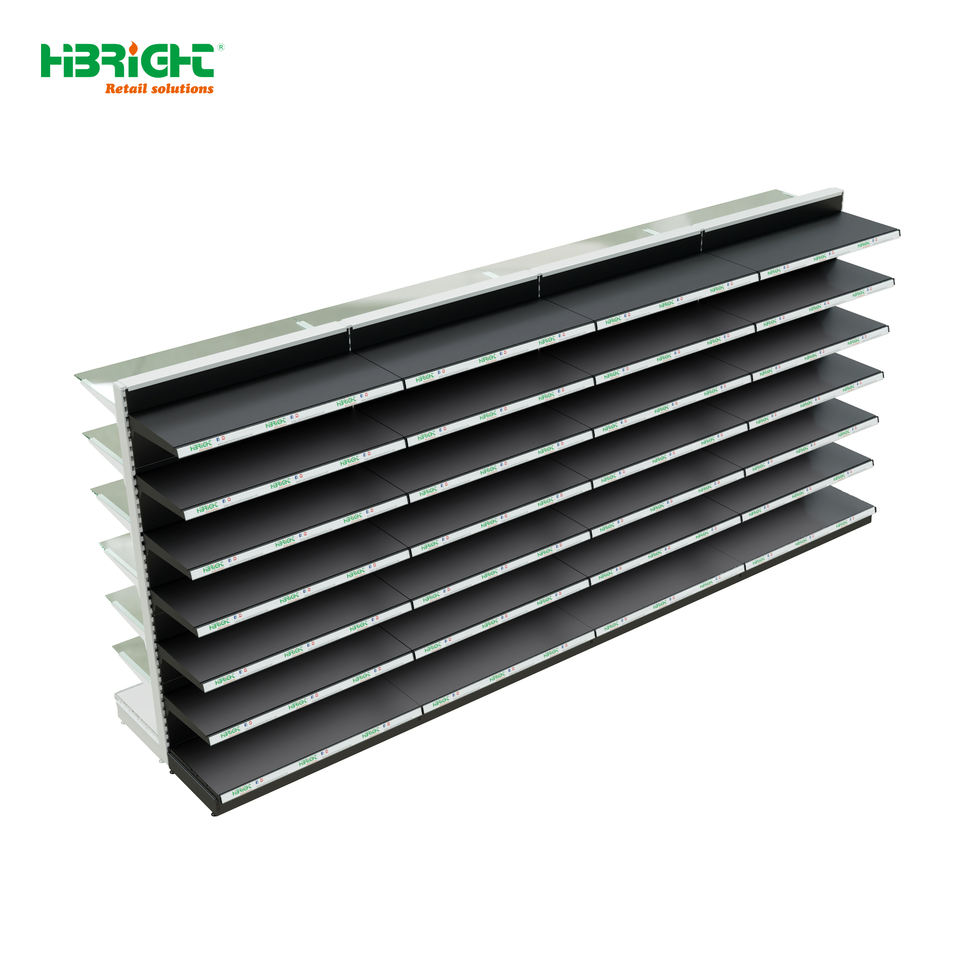 ชั้นวางสินค้าซุปเปอร์มาร์เก็ตแบบโลหะสองด้าน 4 ชั้น รับน้ำหนักเบา สำหรับร้านค้าปลีก ขายส่งโดยตรงจากผู้ผลิต