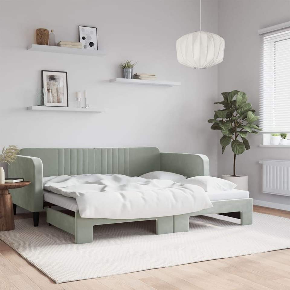 เตียงนอนผ้ากำมะหยี่สีเทาอ่อนขนาด 39.4"x74.8" พร้อมที่นอนแบบมีล้อเลื่อนขนาด 39.4"x74.8" เตียงนอนผ้ากำมะหยี่พร้อมที่นอนแบบมีล้อเลื่อน