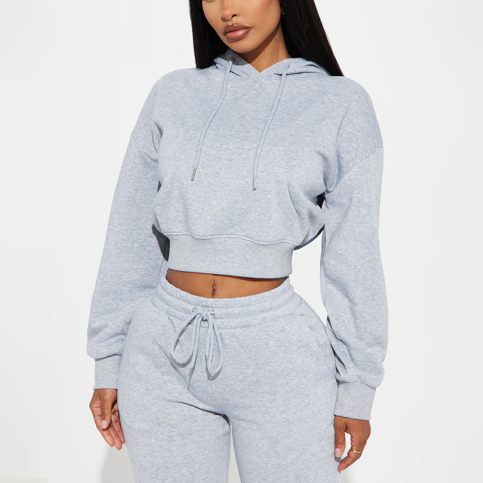 เสื้อฮู้ดดี้สีเทาอ่อน ผ้าฝ้าย 100% แบบครอป มีเชือกผูก ขอบยางยืด ผ้าฟลีซเนื้อนุ่ม สำหรับสไตล์มินิมอลสตรีทแวร์ และความสบายในชีวิตประจำวัน
