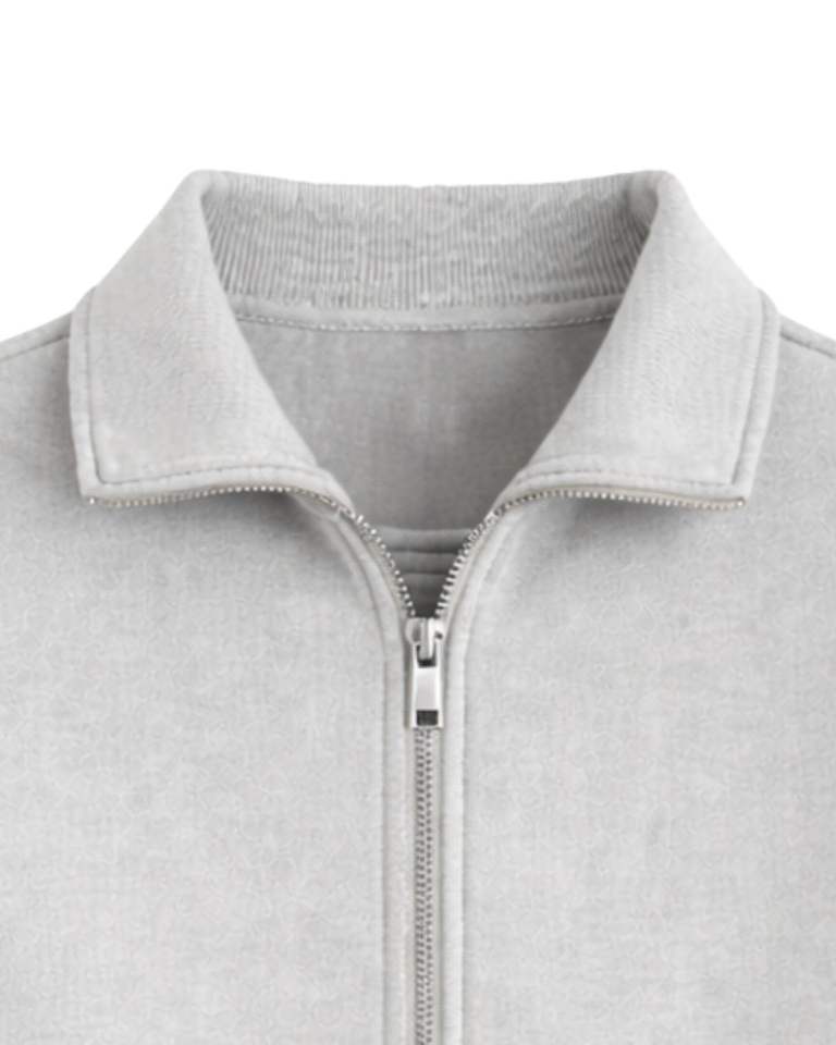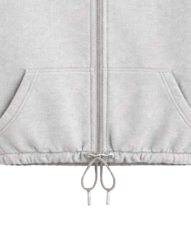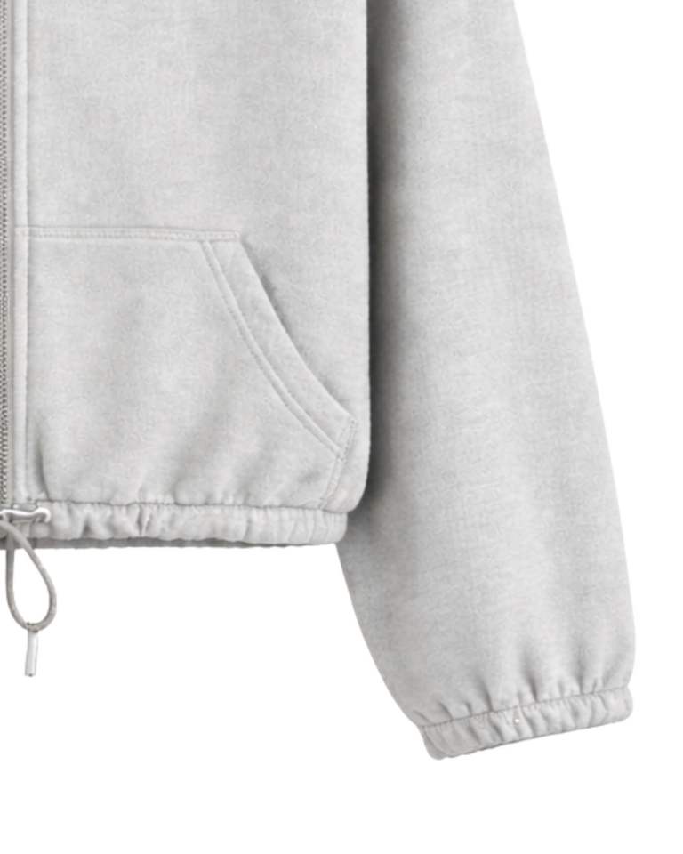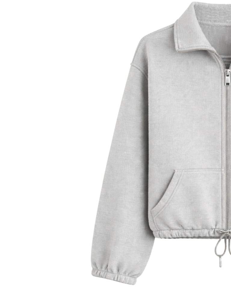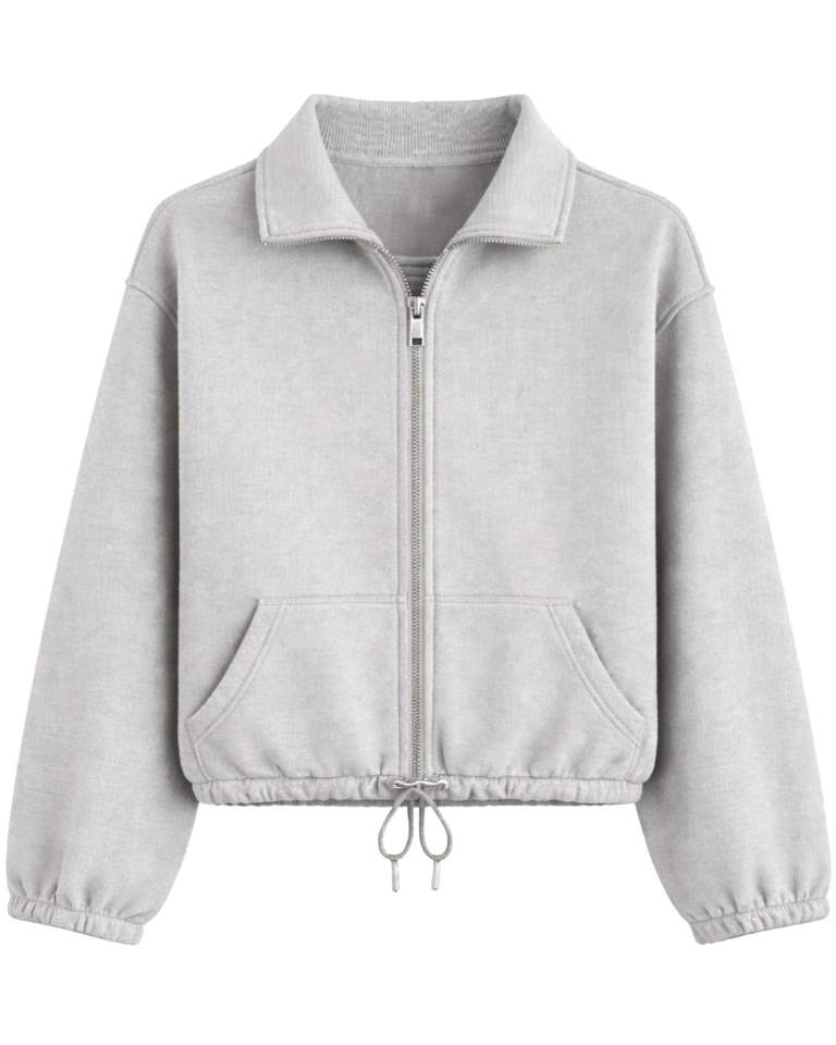 เสื้อสเวตเชิ้ตผ้าฟลีซสีเทาอ่อนแบบครอป ซิปยาวเต็มตัว คอปกโปโล มีกระเป๋าหน้า ปรับเชือกผูกชายเสื้อได้ สไตล์ลำลอง อุ่นสบาย เหมาะสำหรับใส่เดินเล่น