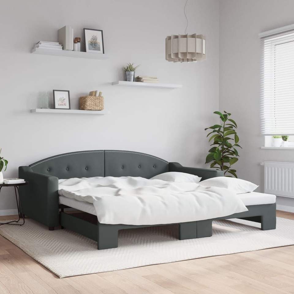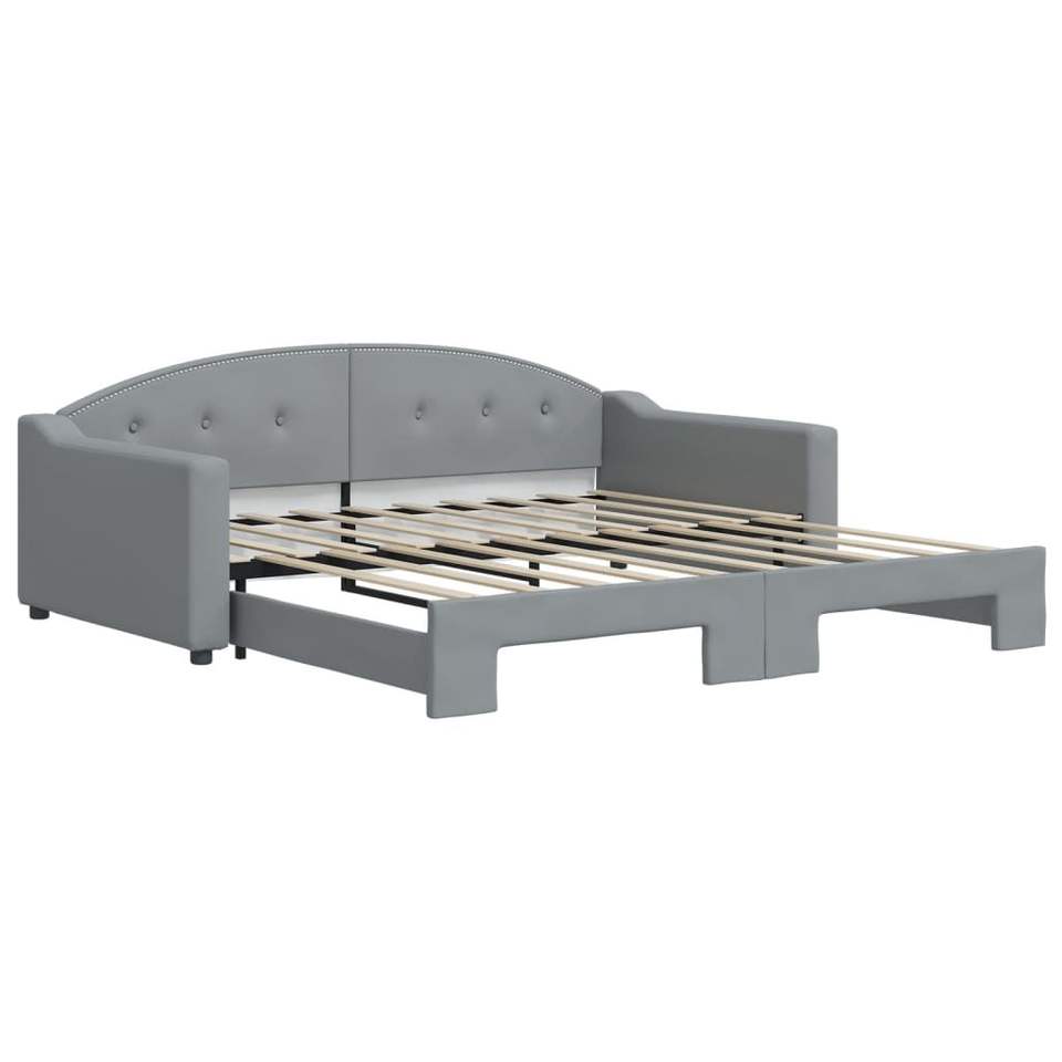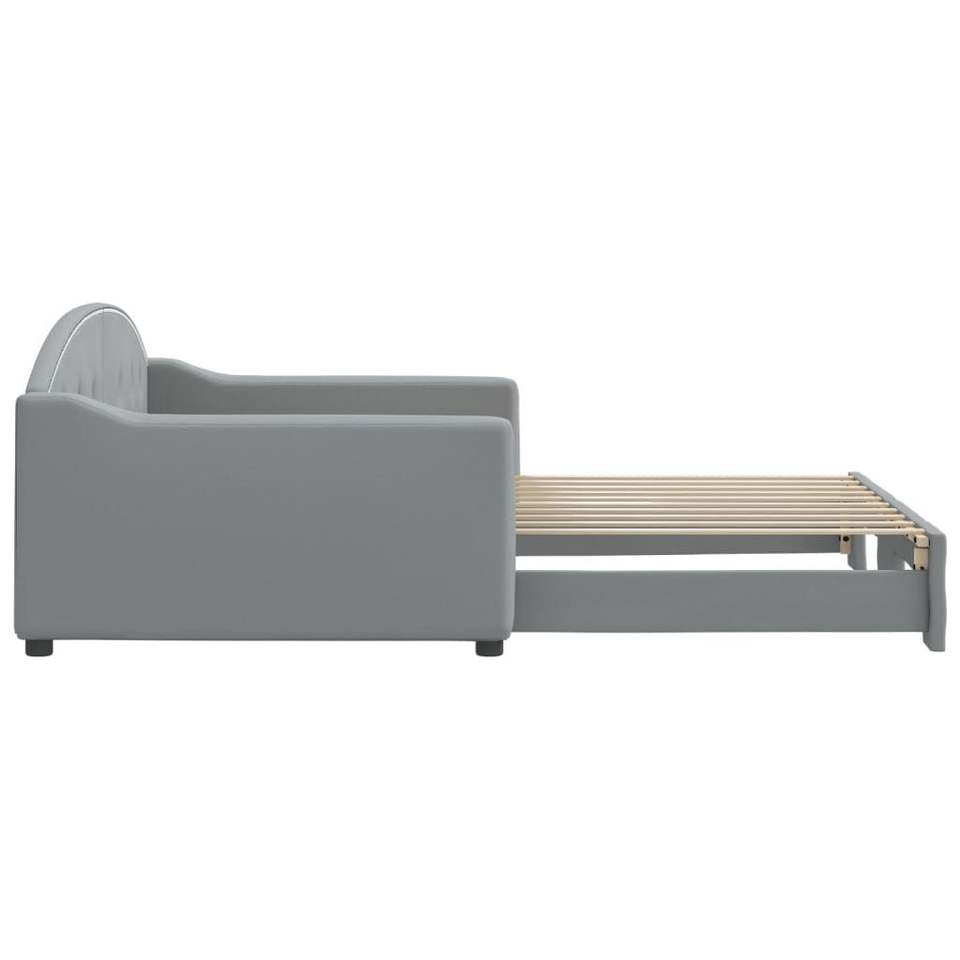 เตียงนอนกลางวันสีเทาอ่อนทำจากโพลีเอสเตอร์ พร้อมเตียงเสริมแบบมีล้อเลื่อน โครงโลหะ ไม้ ไม้อัด และโฟม ให้ความสบาย