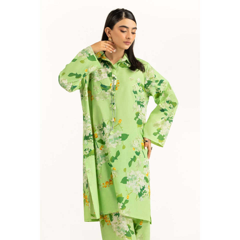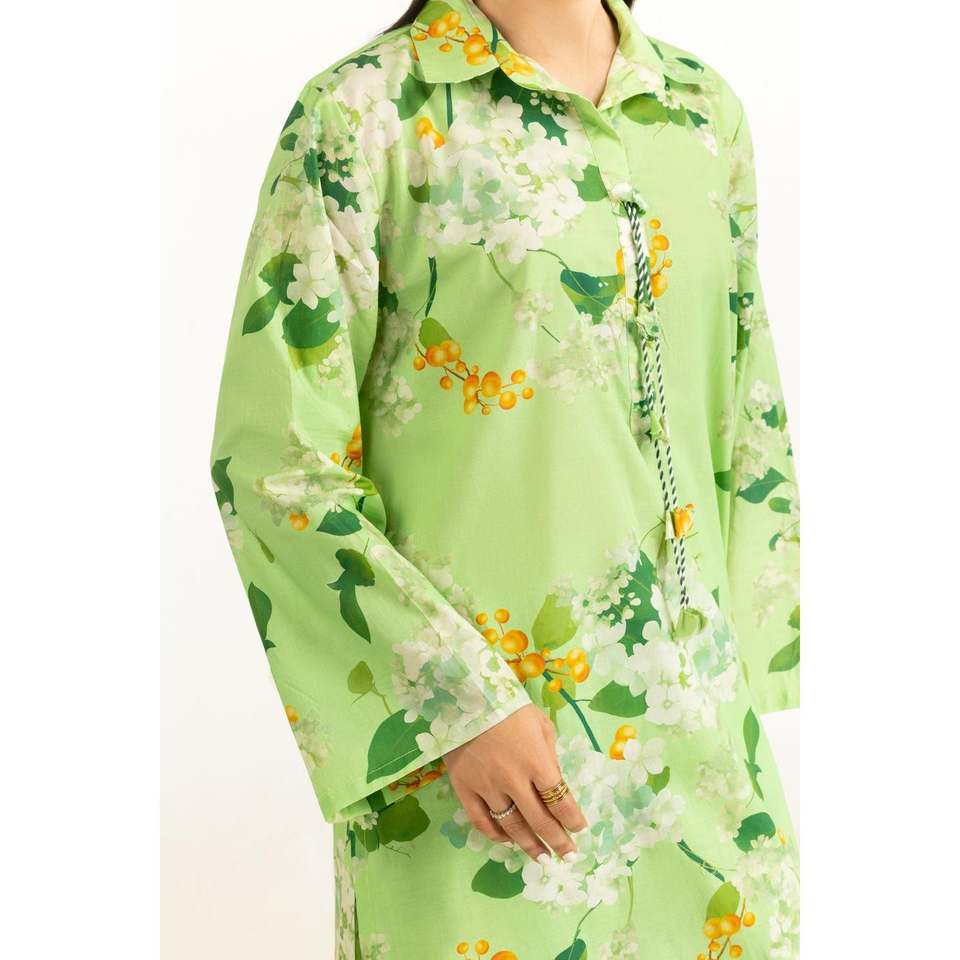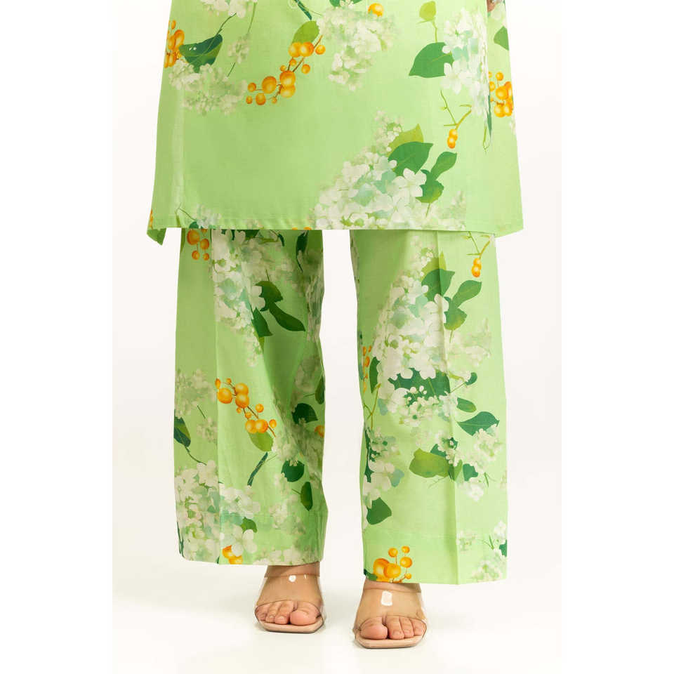 ชุดเซ็ตเสื้อผ้าพิมพ์ลายสีเขียวอ่อนสำหรับผู้หญิง สไตล์ลำลอง ชุดสองชิ้น กางเกงขาสั้น ไซส์ XS-XXS สำหรับฤดูใบไม้ผลิ/ฤดูร้อน