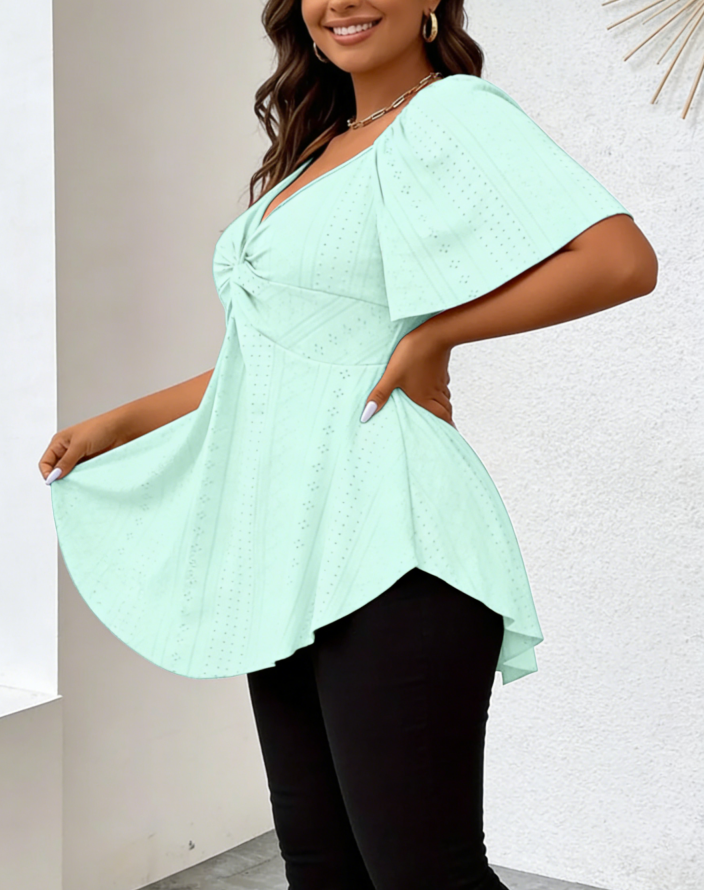 เสื้อเชิ้ต/เสื้อเบลาส์แขนสั้นผ้าใยนม 3 มิติ คอวีผูกโบว์ สีเขียวอ่อน ไซส์พลัส สำหรับผู้หญิง ฤดูใบไม้ผลิ ฤดูร้อน ฤดูใบไม้ร่วง สไตล์ลำลอง