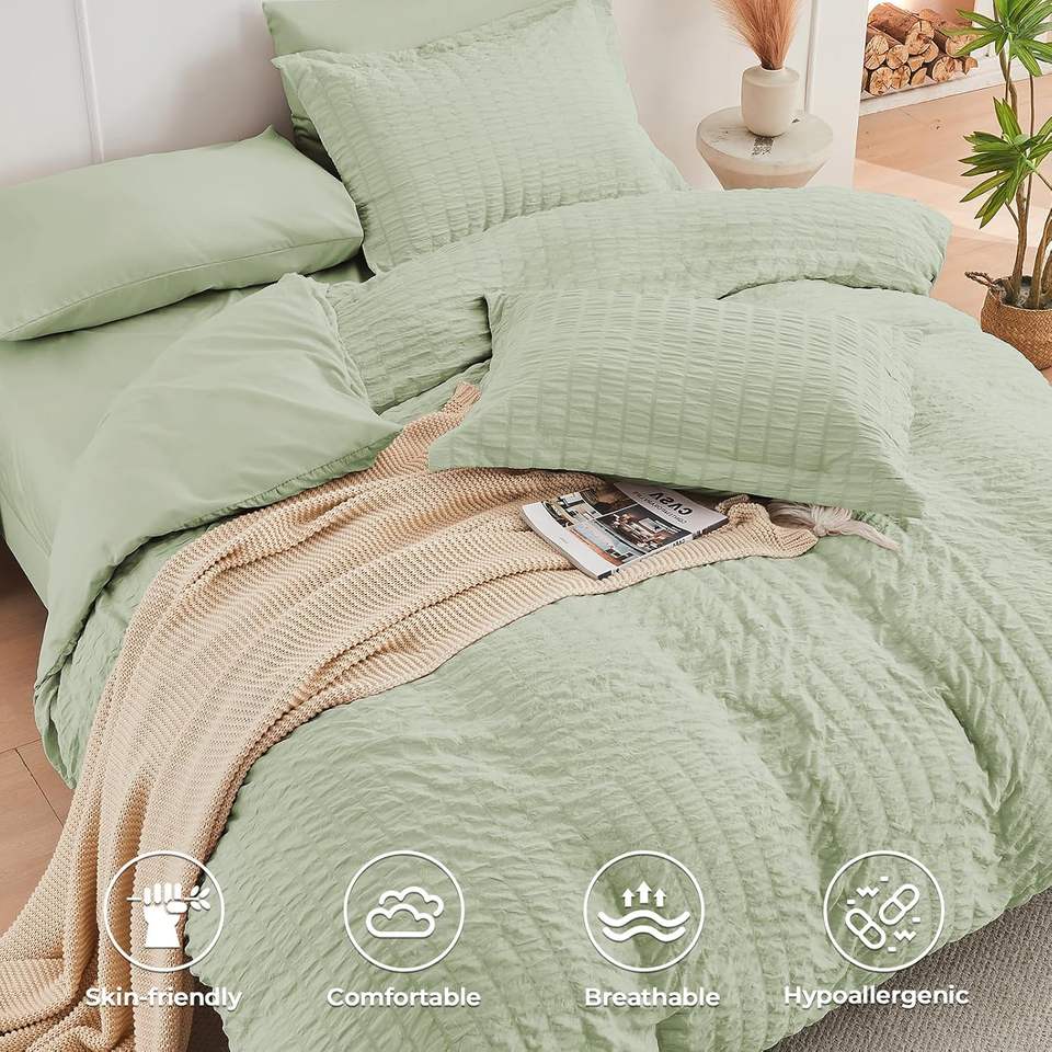 ชุดผ้าปูเตียงคิงควีนไซส์สีเขียวอ่อน Seersucker ชุดเครื่องนอน7ชิ้นสำหรับทุกฤดูกาลพร้อมผ้าคลุมเตียงผ้าปูที่นอนปลอกหมอนผ้าคลุมไหล่