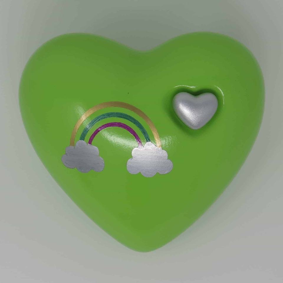 โถใส่เถ้ากระดูกรูปหัวใจสีเขียวอ่อนพิมพ์ลายรุ้ง พร้อมจี้รูปหัวใจขนาดเล็กสำหรับใส่เถ้ากระดูกในพิธีศพ ทำจากโลหะทองเหลือง/อะลูมิเนียม