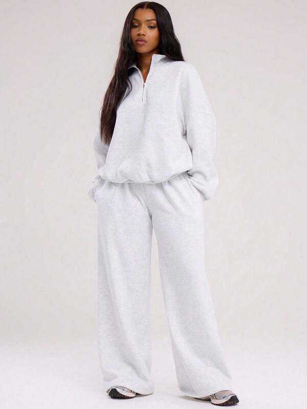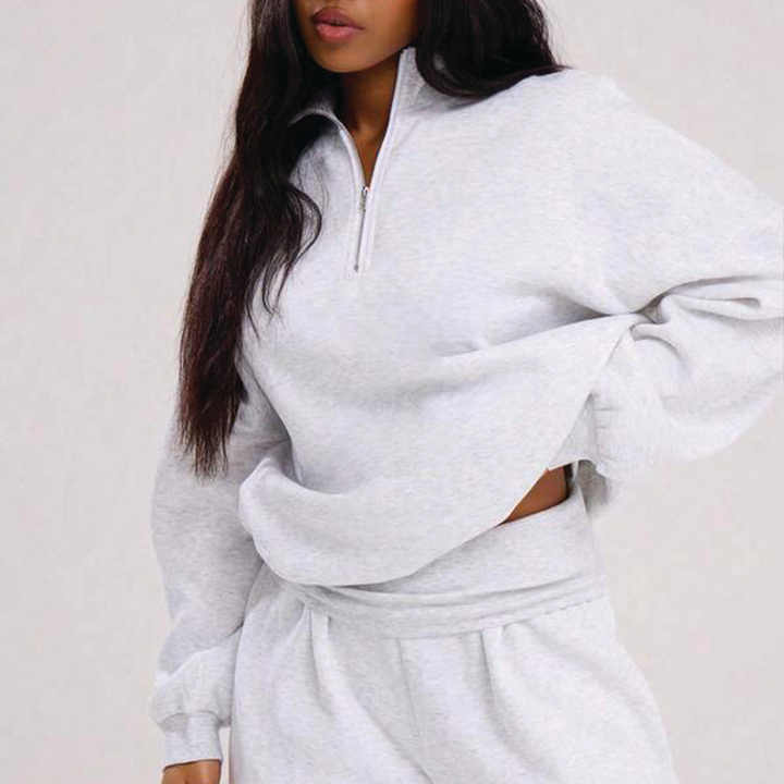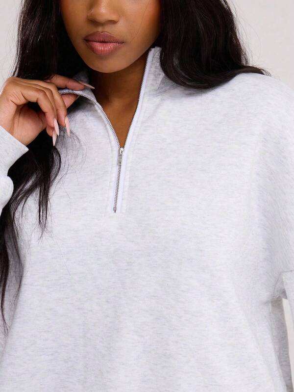 เสื้อสเวตเชิ้ตสีเทาอ่อนแบบโอเวอร์ไซส์ คอสูง ซิปครึ่งตัว ผ้าฝ้ายฟลีซ ทรงหลวม แขนยาว สีพื้น เรียบง่าย สไตล์ลำลอง สำหรับผู้หญิง