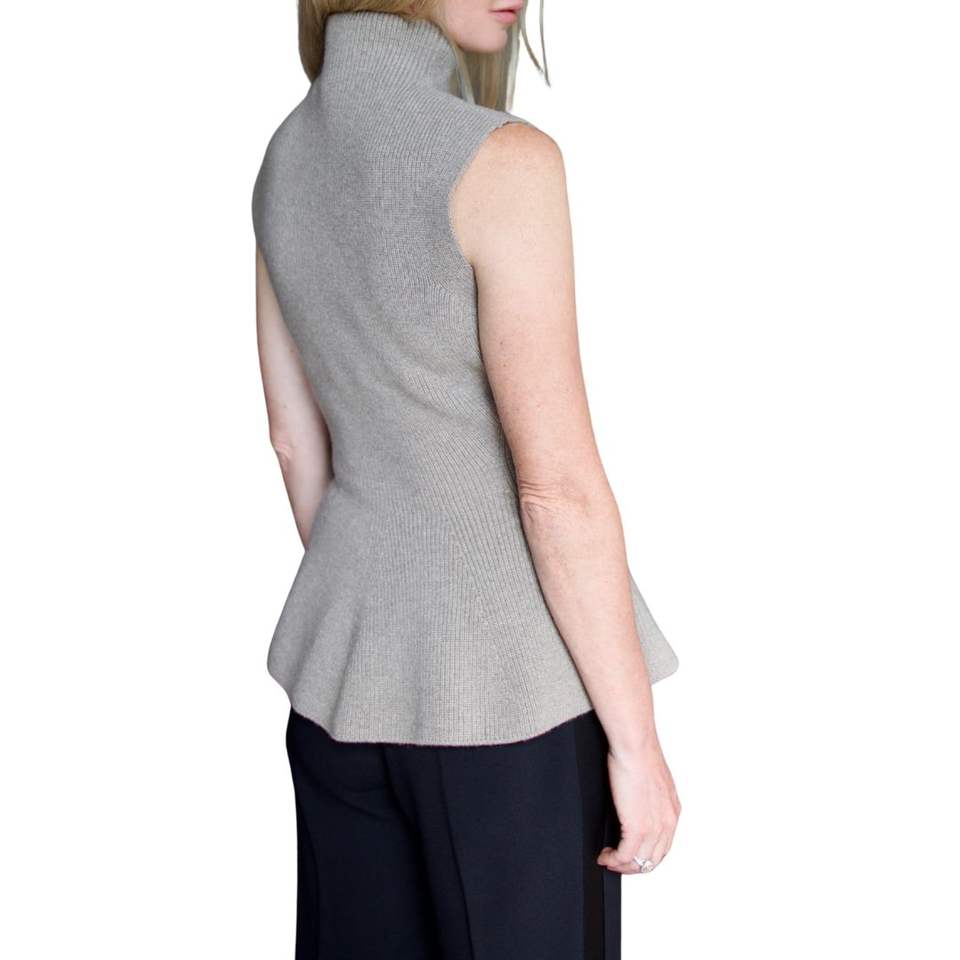 เสื้อกล้ามถักไหมพรมสีเทาอ่อนสำหรับผู้หญิง ทรงเปปลัม คอเต่า แขนกุด ทรงเข้ารูป ผ้าถักลายริบ