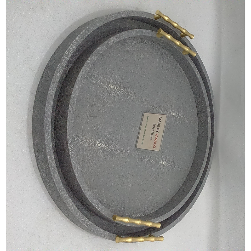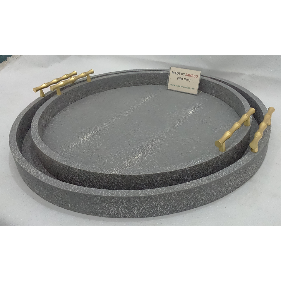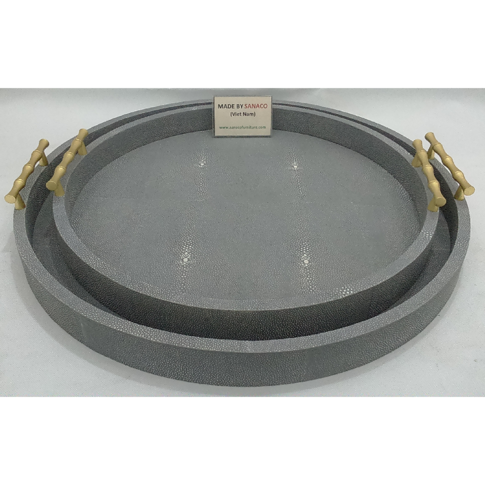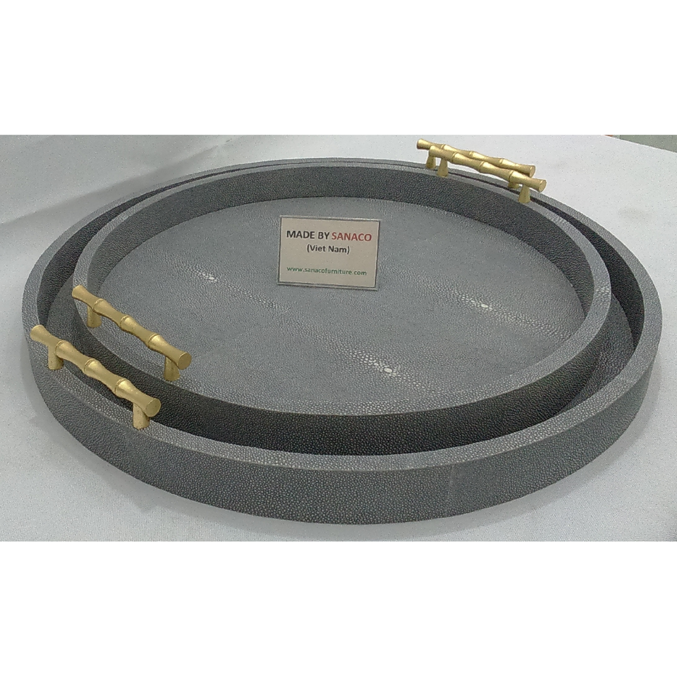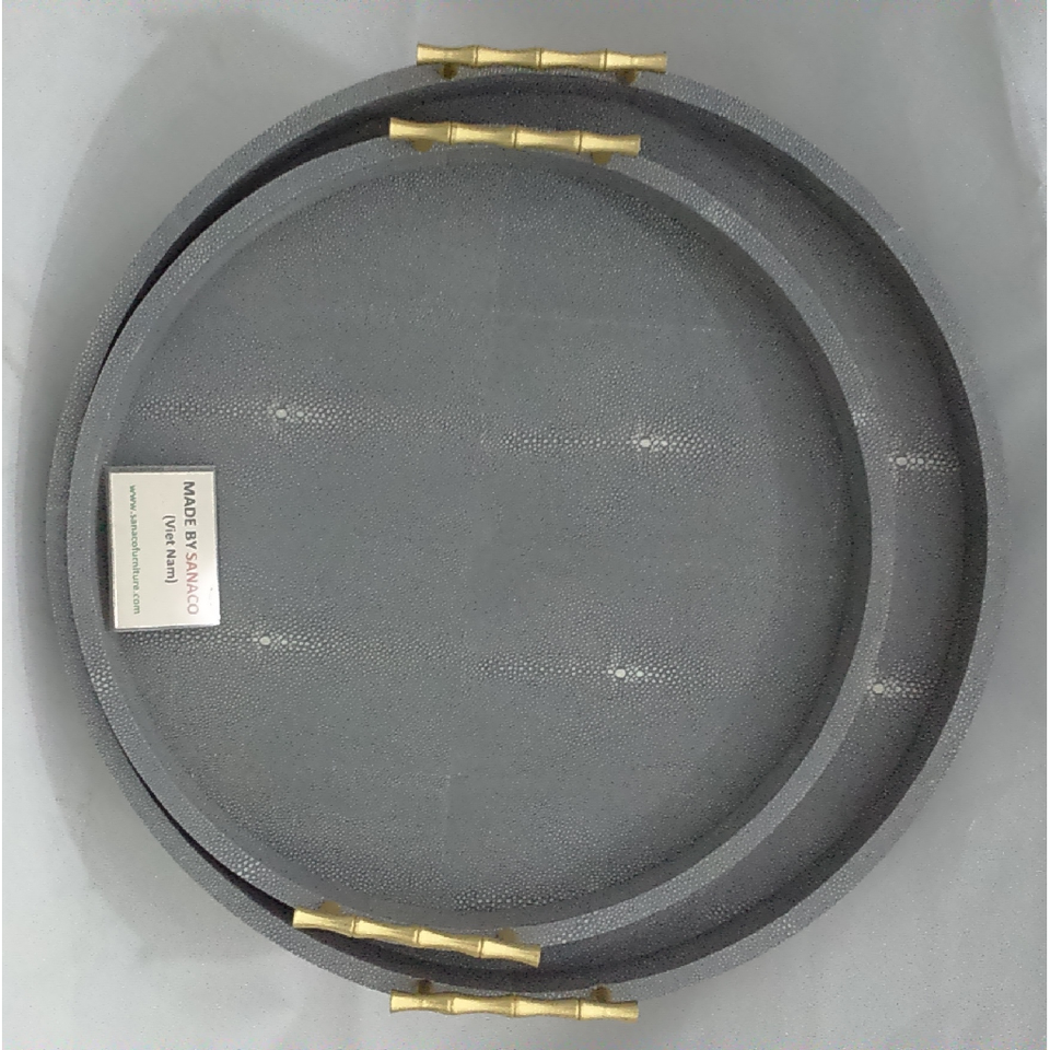 สีเทาอ่อน0.51X0.51X0.075ทองเหลืองด้ามไม้ไผ่ Faux Shagreen ถาดกลม