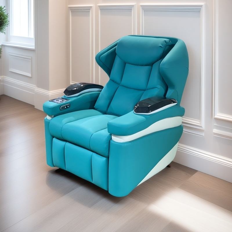 โซฟาหนังแท้ดีไซน์หรูหรา สีน้ำเงิน ปรับเอนด้วยระบบไฟฟ้า เหมาะสำหรับบ้านพักตากอากาศขนาดใหญ่ ฟังก์ชั่นครบครัน ใช้ดูหนังได้